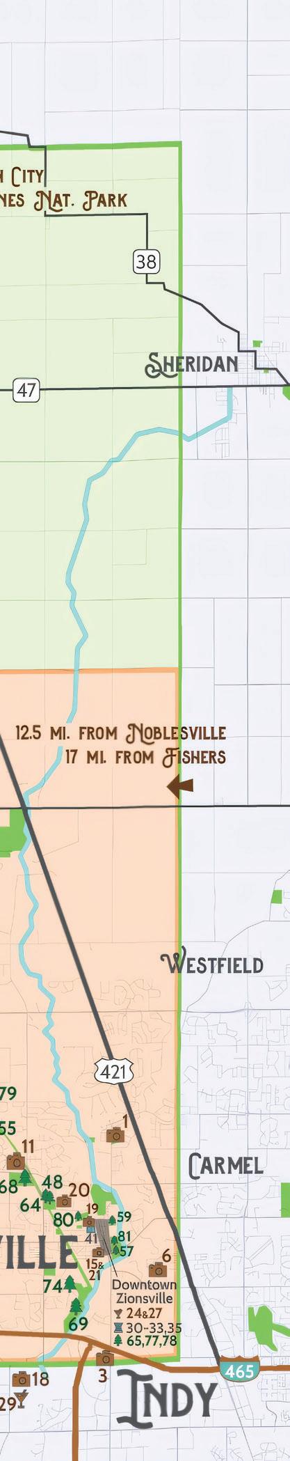 The tracks were fully removed in 1985. The trail provides more than 20 miles of paved surface and scenic views of urban landscapes and rural farmlands, perfect for walking, running or biking. The trail extends from the trailhead on Plum Street in Thorntown through Lebanon’s Courthouse Square, picking up again in Whitestown at 575 E. and connecting for more than eight miles through Whitestown and Zionsville to its conclusion at the trailhead on Zionsville Road.