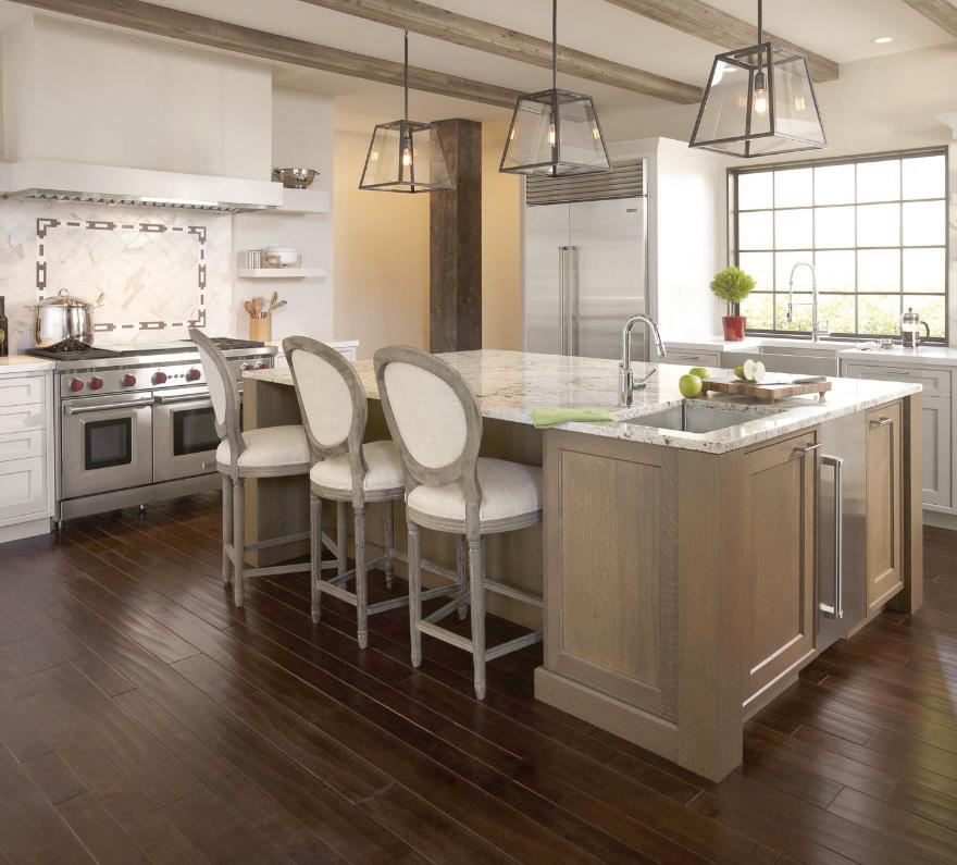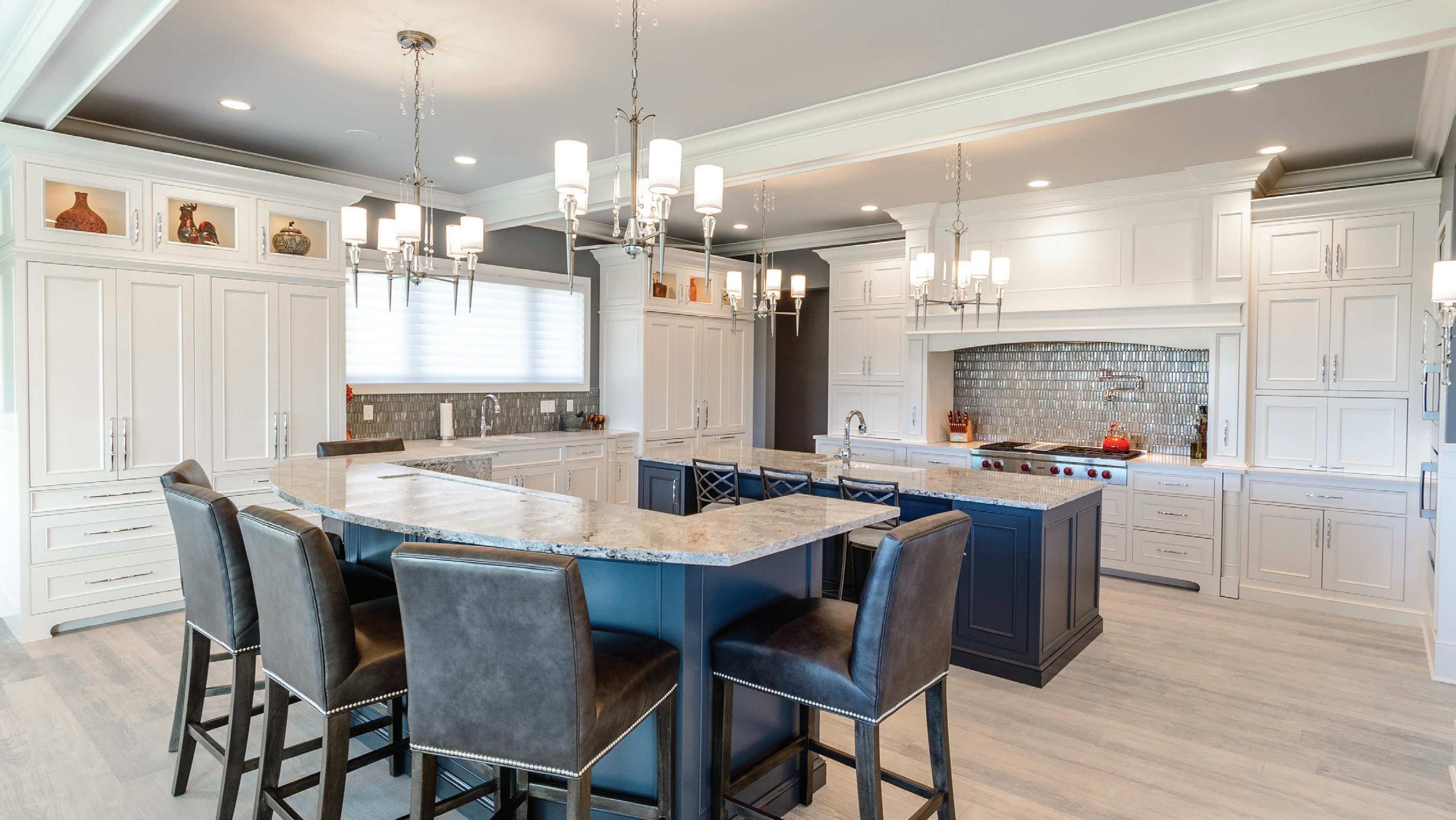 She explains that the monochromatic all white, taupe, or gray on gray interiors are moving on, while earth tones and colors found in nature are having their moment, from blues and greens to gold and burgundy. “In the kitchen this is next – darker countertops. We’re moving away from white and using raisin, light, icy blue, cool taupes and browns and creamy whites.” She points out that most of Northeast Ohio is gray throughout the winter months, so brightening up woodwork and mixing whites with warm