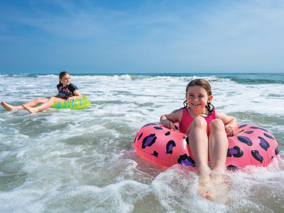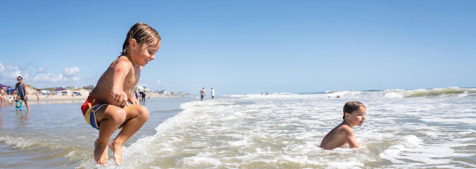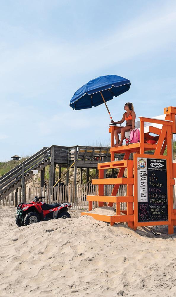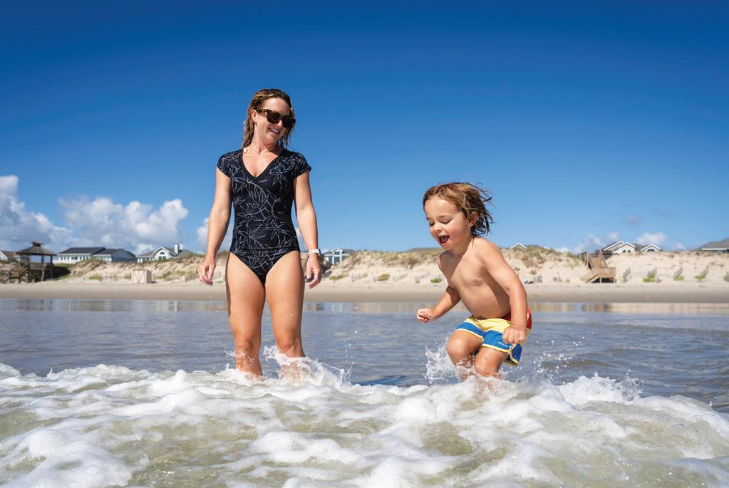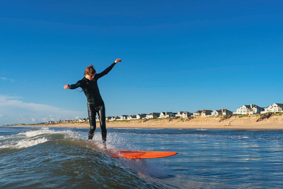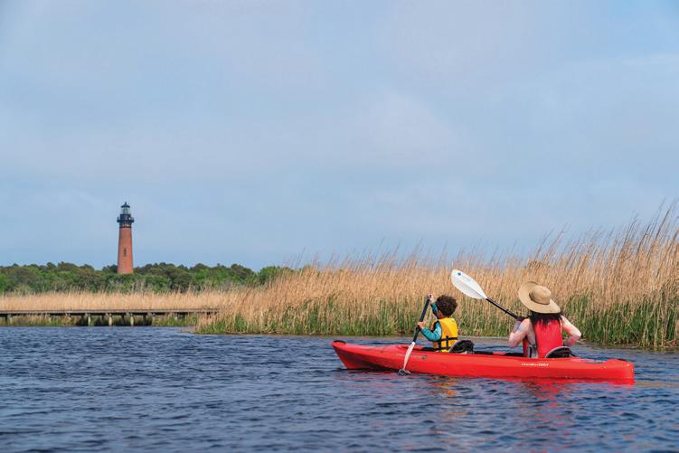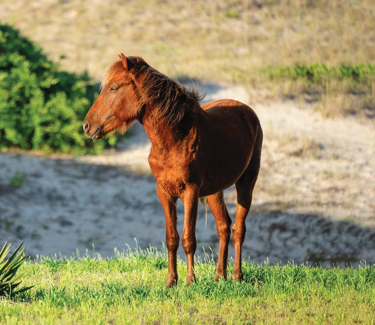 ticket to such a beach vacation. Hop on this highway in Kitty Hawk and head north, where you’ll pass into Currituck County, home of The Northern Outer Banks beaches. You’ll pass the communities of Pine Island, Ocean Sands, Whalehead Beach, Buck Island, Ocean Hill, Corolla Light and more, plus shops, restaurants, and outfitters aplenty, to reach Historic Corolla Village, the historic center of the beaches and home to the Currituck Beach Lighthouse. If you have a fourwheel-drive vehicle, keep heading north along N.C. Highway 12. The paved highway turns to sand and stretches 11 more miles up to the NC/VA border. This beach area, with no paved surfaces and no commercial businesses, is wild and remote, home to the famous Corolla Wild Horses and a favorite 4x4 beach destination.