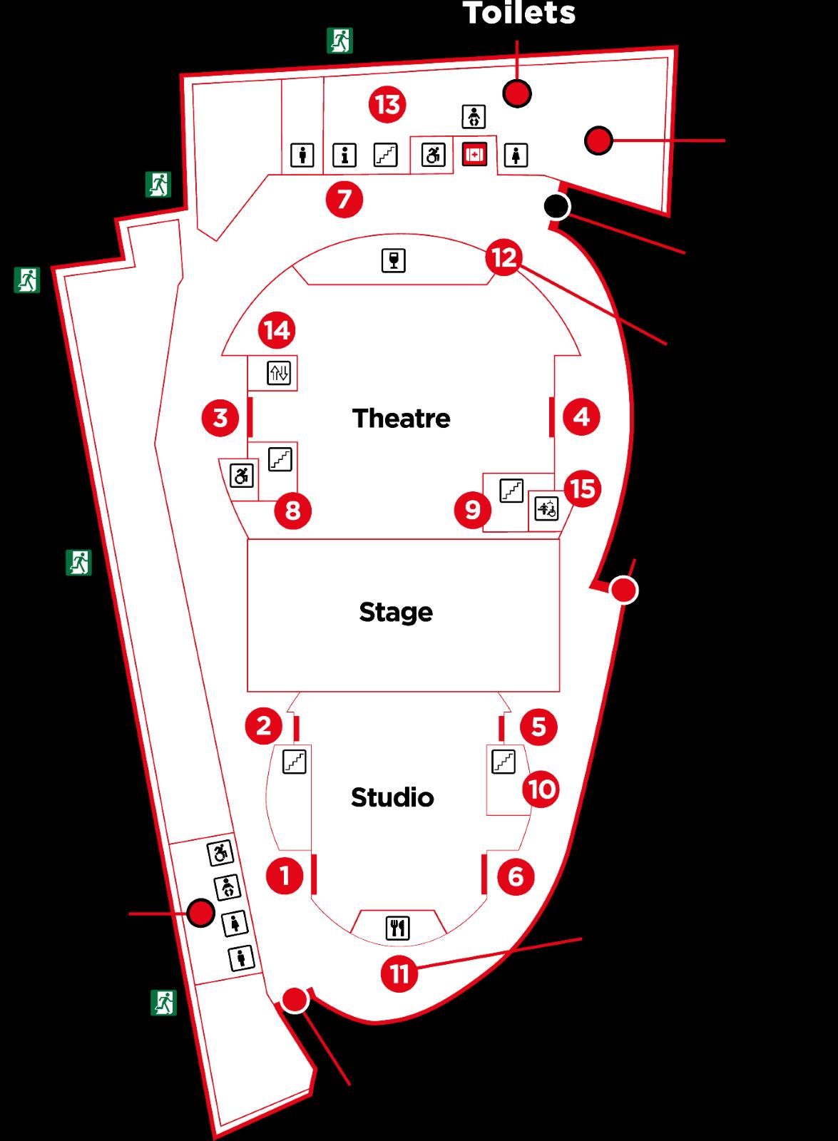 Your ticket will tell you which door to enter through – Studio Theatre Door 1 or 6 - and where to sit, based on a row letter and seat number.