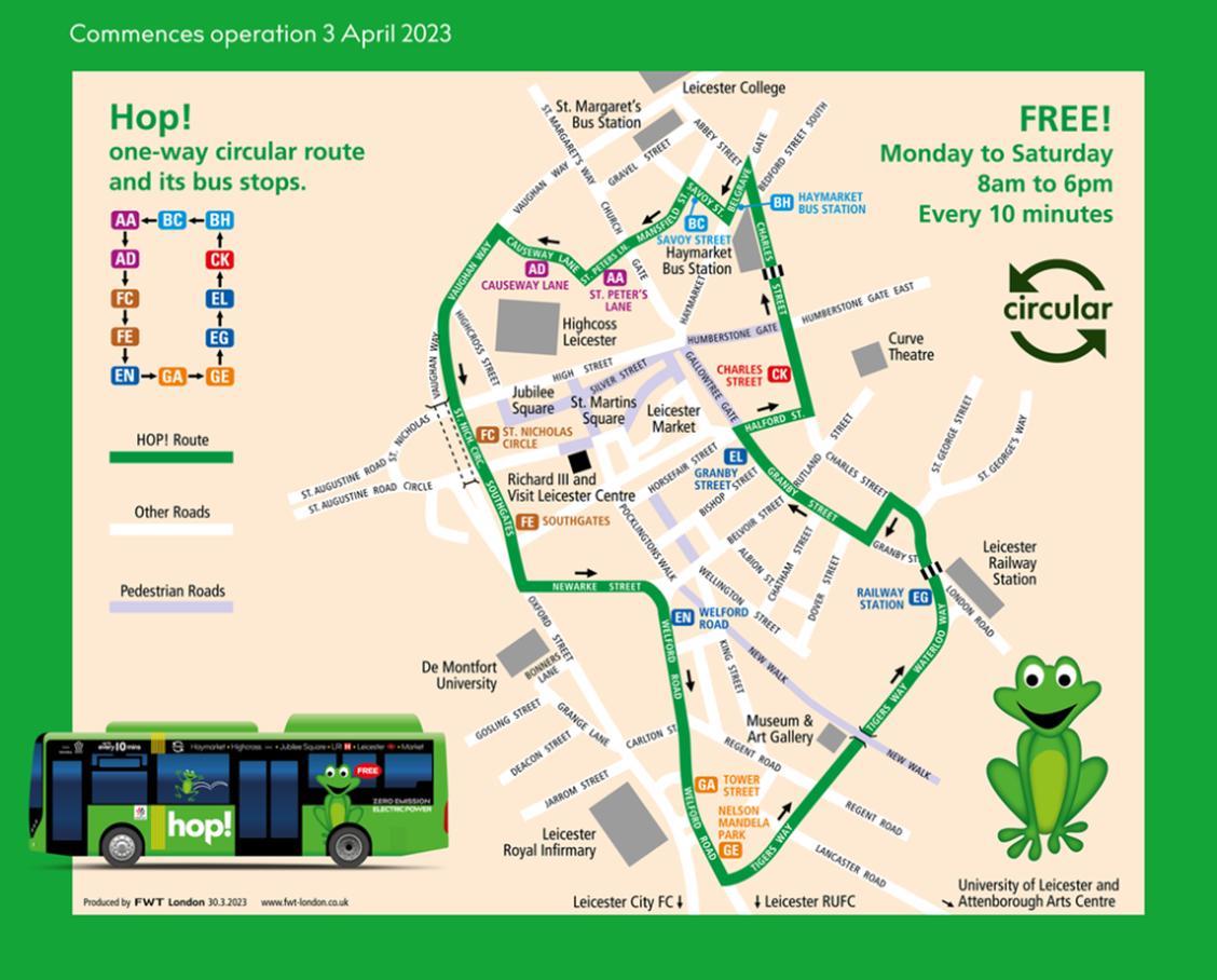 Hop! shuttle buses are free to use and serve Leicester City Centre, looping in an anti-clockwise between Haymarket Bus Station, Highcross, Jubilee Square, Leicester Royal Infirmary, Railway Station and the Market.
