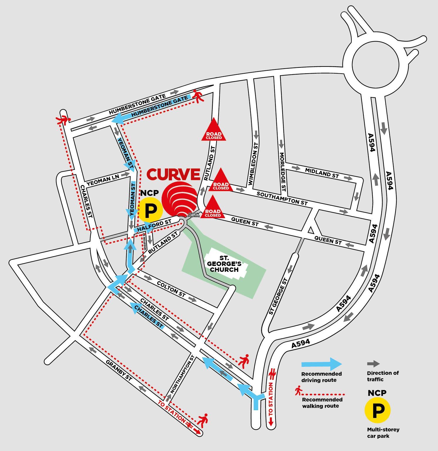 Due to some ongoing building maintenance work at Curve, there are currently road closures in place around our theatre – these are indicated by the red triangles on the map.