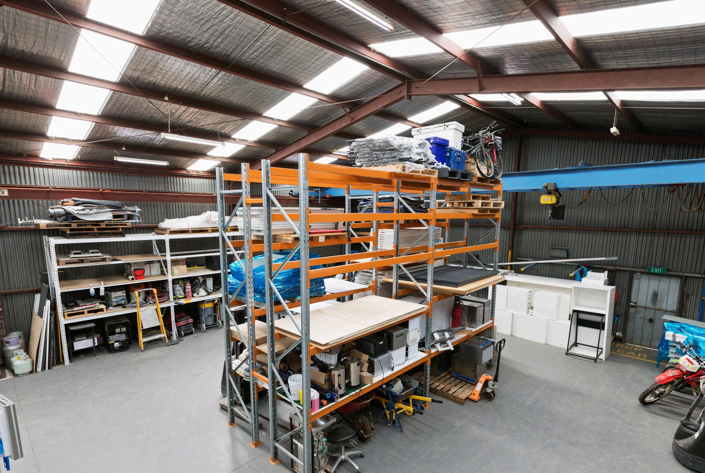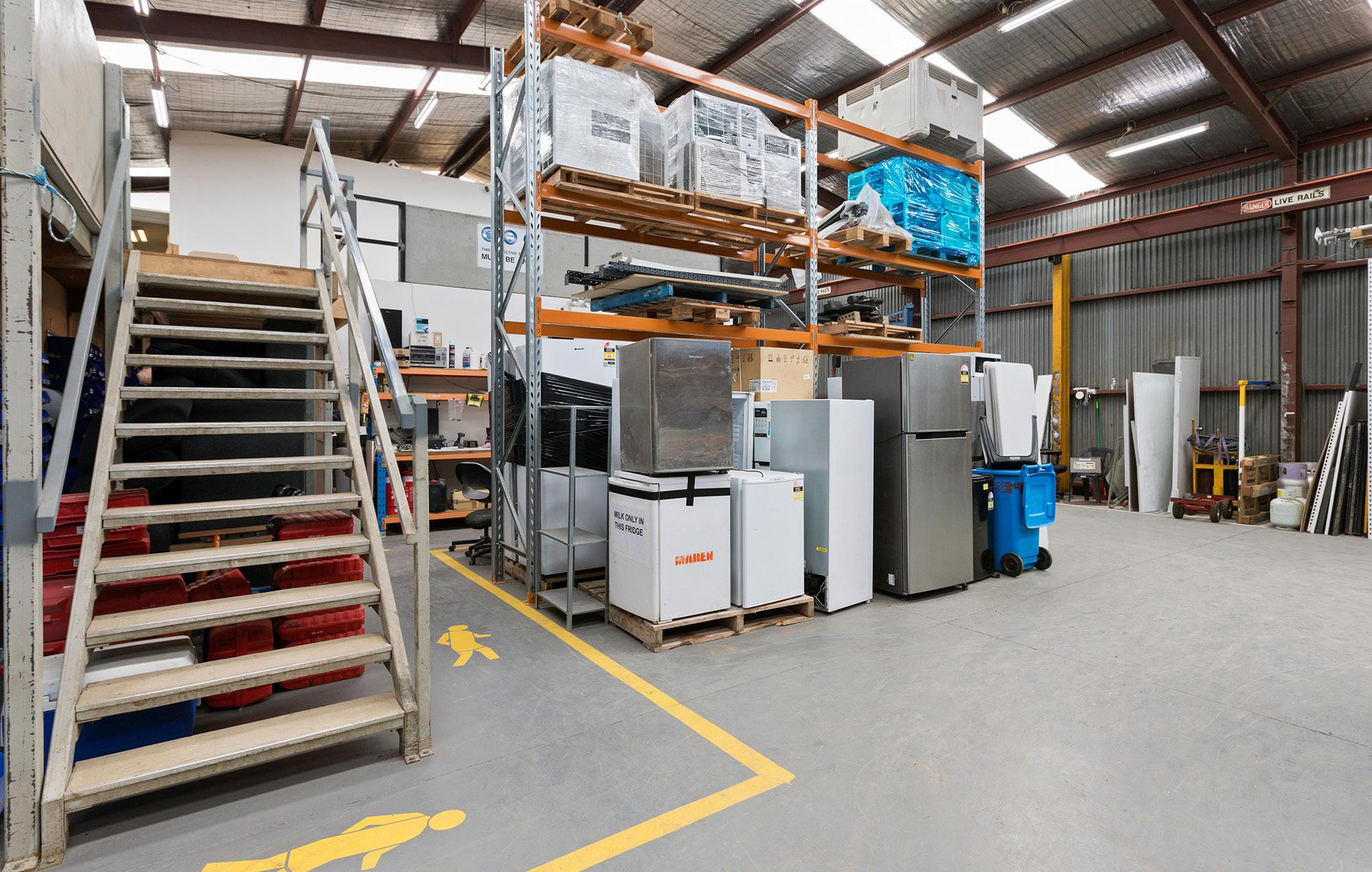 The warehouse area features a clear-span layout with high internal clearance, durable concrete flooring and a container-height roller doors for smooth loading and unloading. Heavy-duty shelving and a mezzanine level offer additional storage flexibility, while high-bay LED lighting ensures a safe and well-lit environment.
