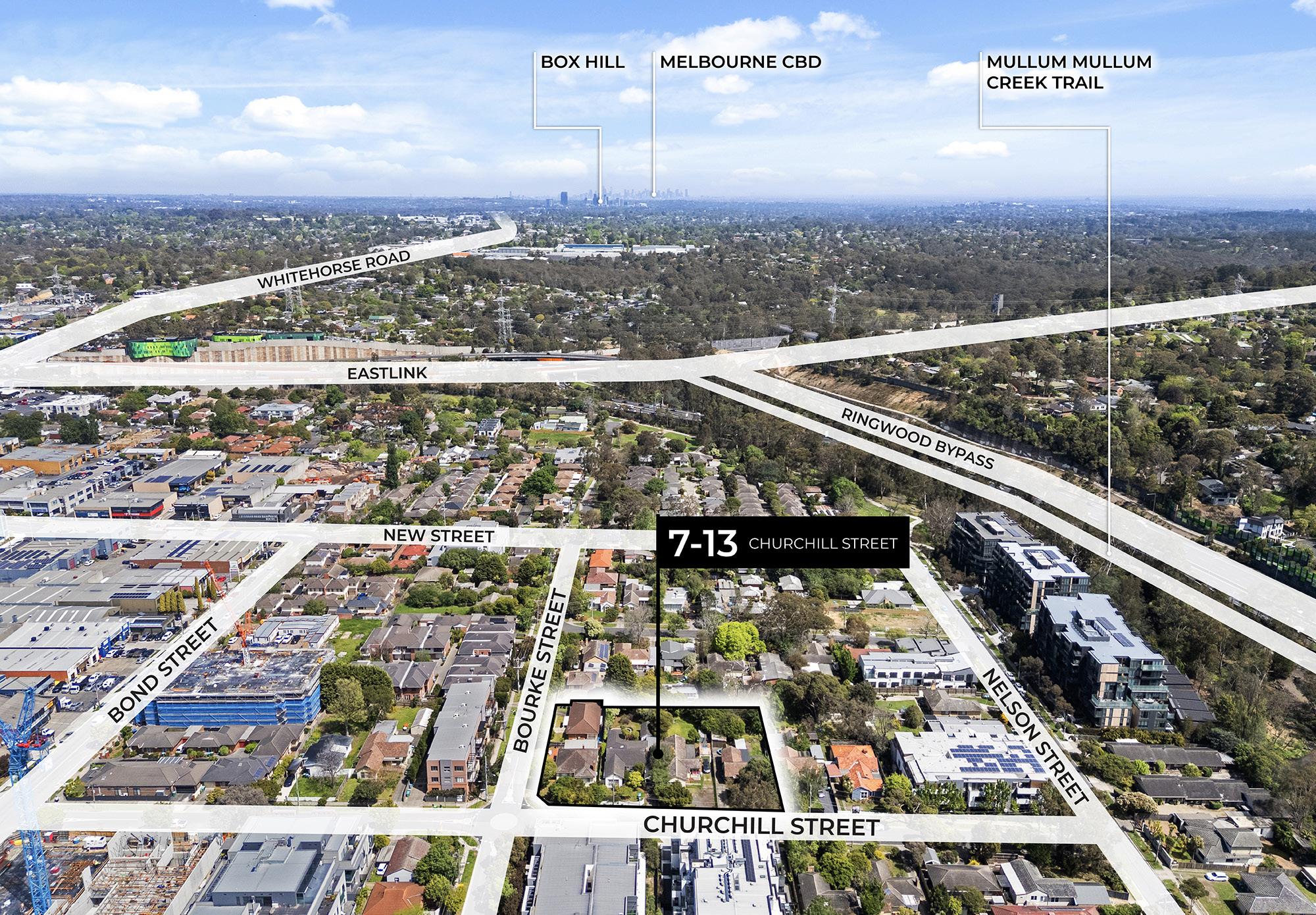 Comprising five existing dwellings across 7–13 Churchill Street, the site presents a mix of single-storey brick and weatherboard homes, each situated on generous allotments with established gardens and dual street frontages to Churchill and Bourke Streets.