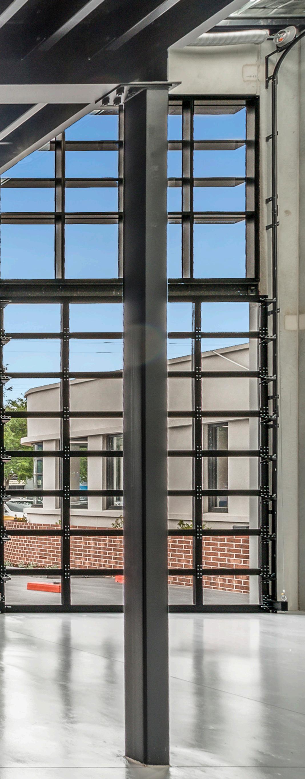 Glass-panel roller doors, soaring 8 m* internal clearance and bold façades