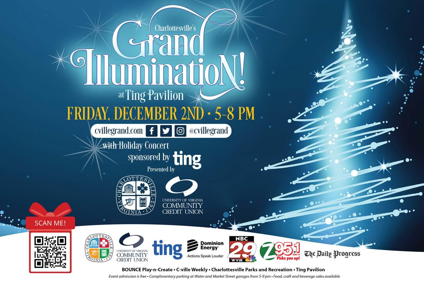 The City of Charlottesville and UVA Community Credit Union will present Charlottesville’s Grand Illumination on that same day, Friday, December 3, from 5:00 to 8:00 p.m. at Ting Pavilion on the Downtown Mall.