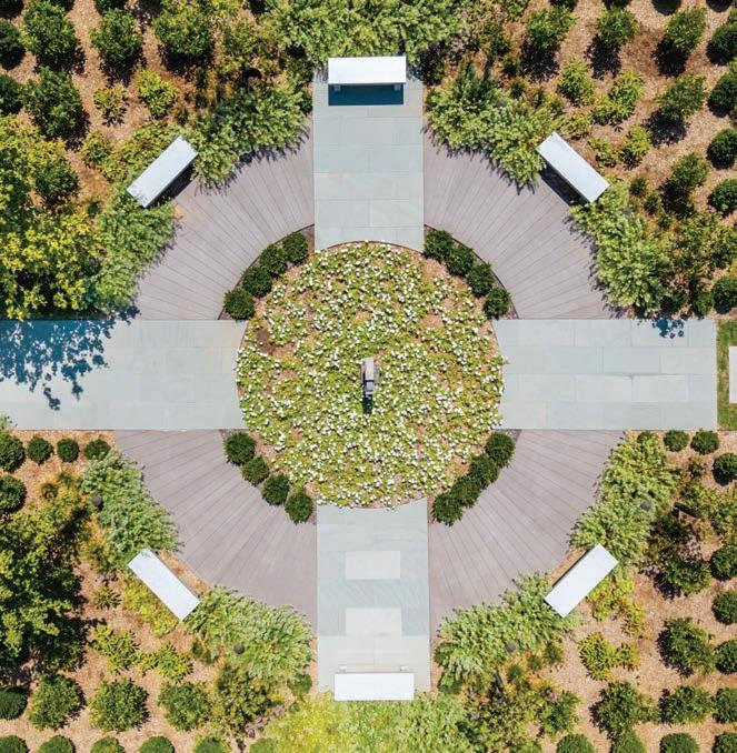 Brick walkways wind throughout the garden beds, leading to a plinth lawn bordered by “pocket gardens” where visitors will find liriope, pink muhly grass, laurel, inkberry, and prairie seed.