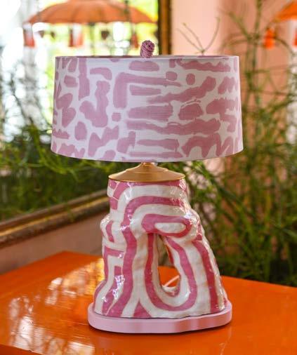 with color and texture,” she says. “Sometimes there’s a little bit of realism; the Blue Ridge Mountains sneak into my work a lot.” Driven by her motto, “art everywhere,” Slaughter translates her original artwork into wallpapers and textiles. “It’s about taking my art beyond the canvas onto other parts of the home. That’s why this lamp collaboration is a perfect thing to do with Abby.”