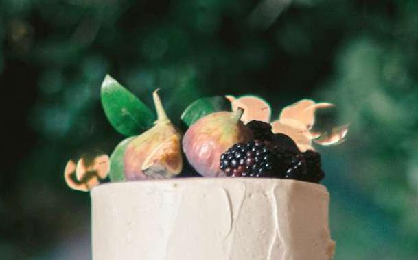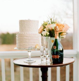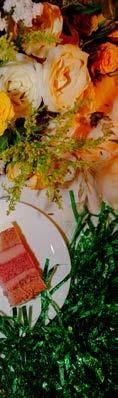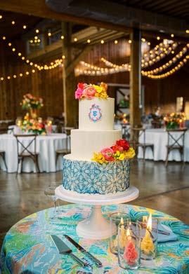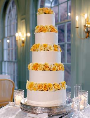 popular now, whether made of buttercream or gum paste or actual fresh flowers. Another popular style is “cakes that look like something your grandmother would have had at her wedding”—decoratively iced with bows and scrolls. The latest trend is millefoglie, an Italian dessert made with vanilla custard and fresh fruit between layers of puff pastry—large, round and flat, unlike the tiered tower.