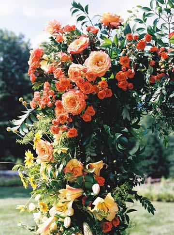 Achieving the goal started with the flowers. Maryland-based Sophie Felts Floral Design brought in live trees for the reception area, creating a kind of enchanted forest vibe. In fact, many guests said they felt they were on a movie set (“Harry Potter, to be exact,” says Emily). From there, a floral ceremony arch featured an ombre of orange, yellow, and fuchsia,