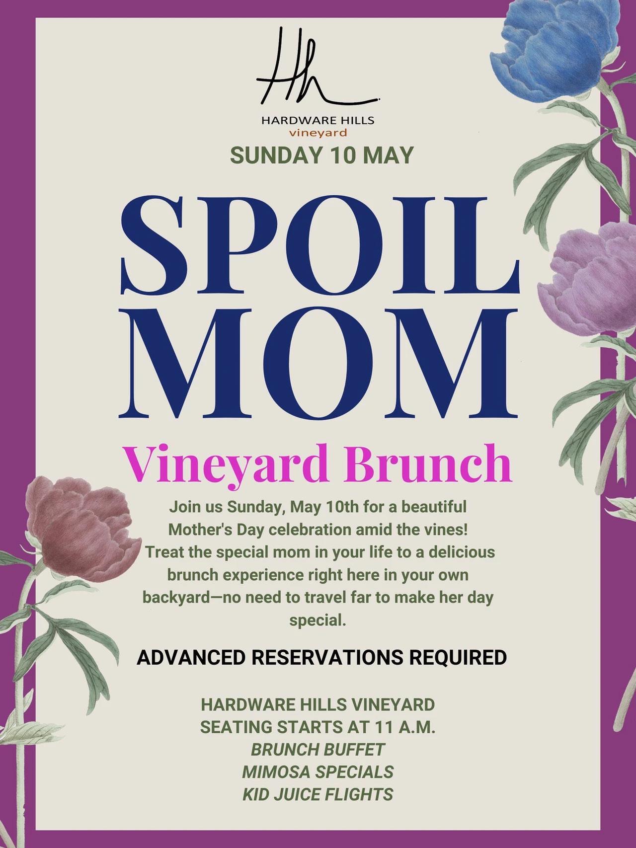 May 10th – 11 am – 2 pm, Mother’s Day Buffet Brunch: Treat mom to a relaxing and beautiful vineyard-side brunch!