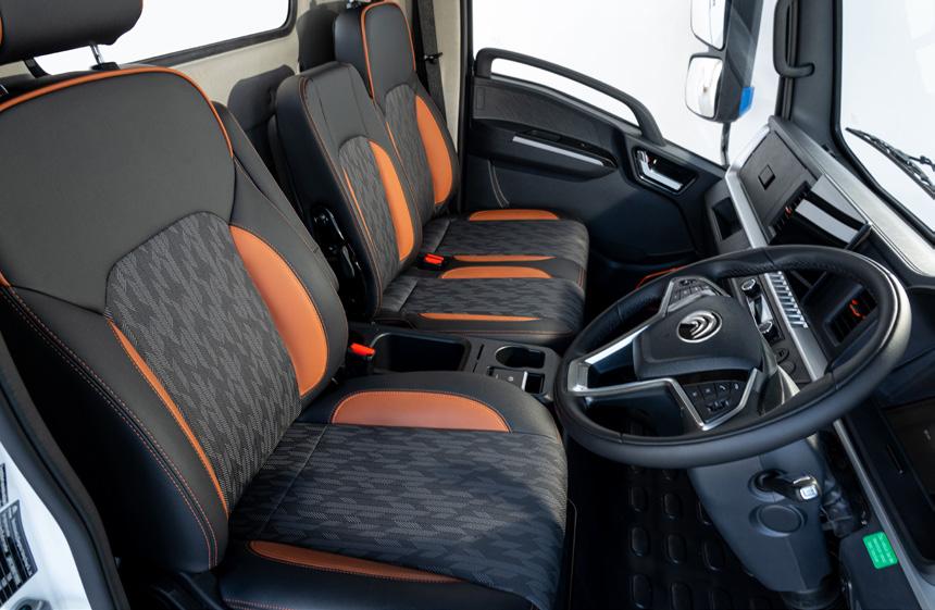 Our box-bodied vehicle was fully loaded so we could get a feel for how it handles at maximum payload, and we came away impressed. The e-axle’s direct delivery of power and torque means the truck feels nippy at roundabouts and junctions, and cruising is comfortable once you’ve managed to find the ‘sweet spot’ on the throttle. It takes a bit of finesse because the truck uses automatic regenerative braking. This kicks in as soon as you lift your foot off the accelerator, upon which the truck starts to slow, with the braking returning power to the batteries. Essentially, this means you can control much of the vehicle’s speed and braking just on the throttle pedal when cruising, and it quickly becomes second-nature.