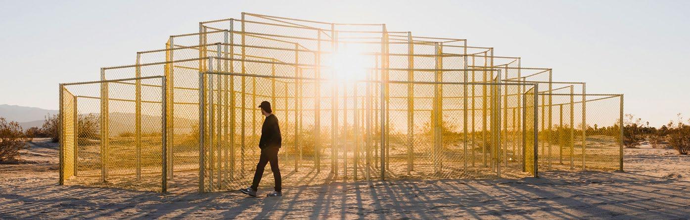 Rana Begum is a British-Bangladeshi artist whose work blurs boundaries between painting, sculpture, design and architecture. She is influenced by both minimalism and her childhood experiences encountering spiritual architecture in Bangladesh. Responding to the ubiquity of the chainlink fence as a pattern spread across the Coachella Valley — a material that is meant to protect but also carries associations of violence — Begum diffuses the material’s role as a divider through her manipulation of its form and color. Her art piece, No. 1225 Chainlink, changing with the movement of the sun and the visitors inside of it, the work emphasizes that nothing in life is static; everything, from the world outside to our