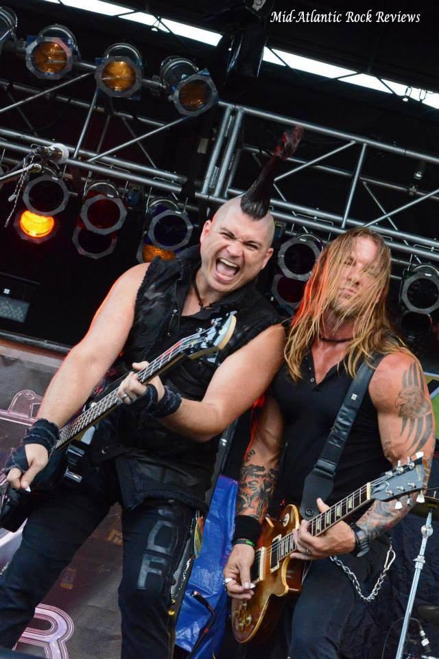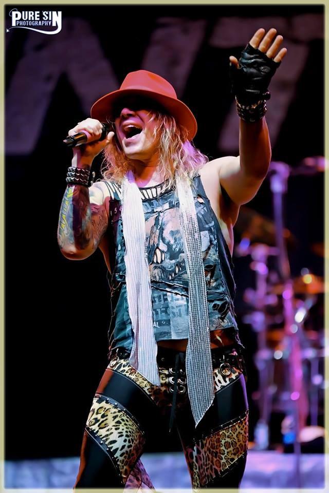Steel Panther was quite the hit. I have never seen them before so I was not sure what exactly to expect. I was certainly in for a surprise. Lexi Foxx was by far my favorite, having a background as a makeup artist. I loved it when he pulled out his pink hand held vanity mirror bedazzled with his name and applying iridescent pink gloss. He was wearing pink panther print spandex that matched his pink Kramer bass and a leather vest that had his last name on them, and on the back of the vest was an image of a mirror hair and spray bottle with a heart around it. To the side of the stage he had a stand up professional traveling makeup kit that he would go to check himself out and fix his hair spraying it with what I‟m certain was Aqua Net hair spray. The lead singer Michael Starr was all glammed out in black spandex with panther print inlays, a leather vest, and a pink scarf wrapped around his forehead. Satchel the guitar player has the biggest hair on a guy I think I have ever seen. He was in all black with tight leather pants, a blue zebra printed scarf