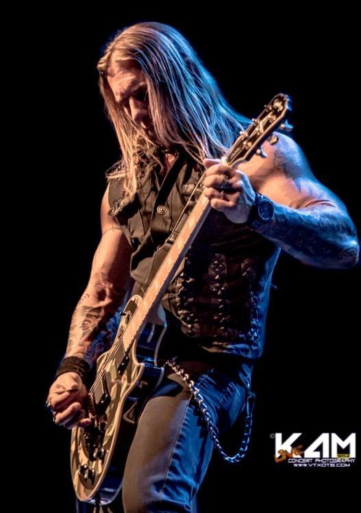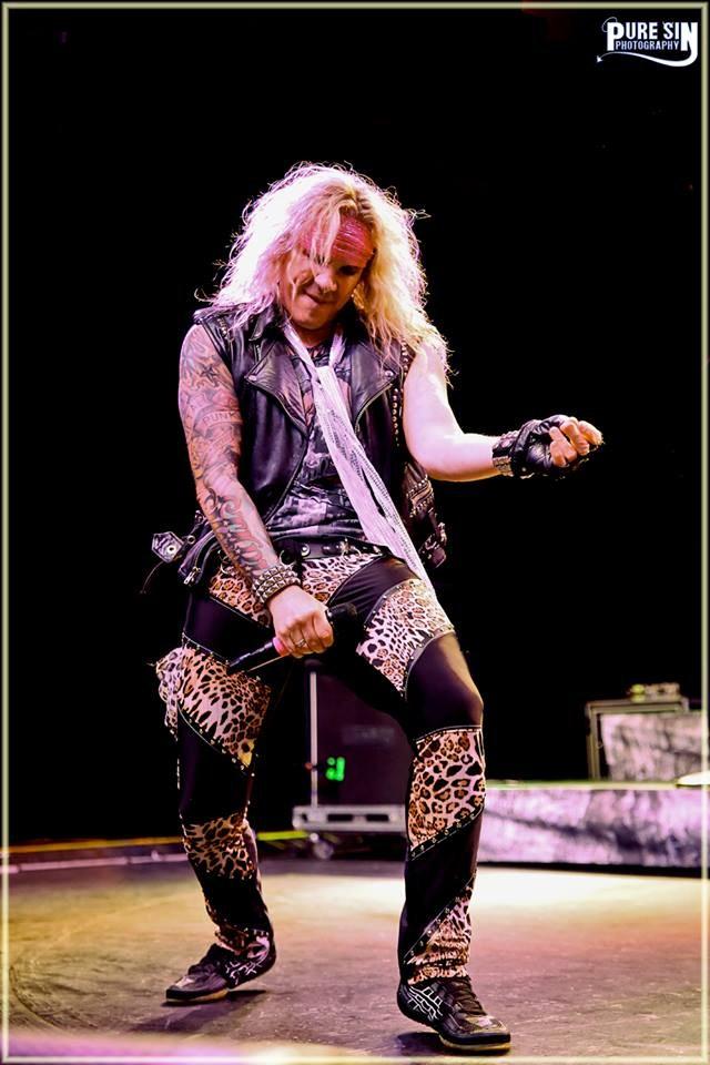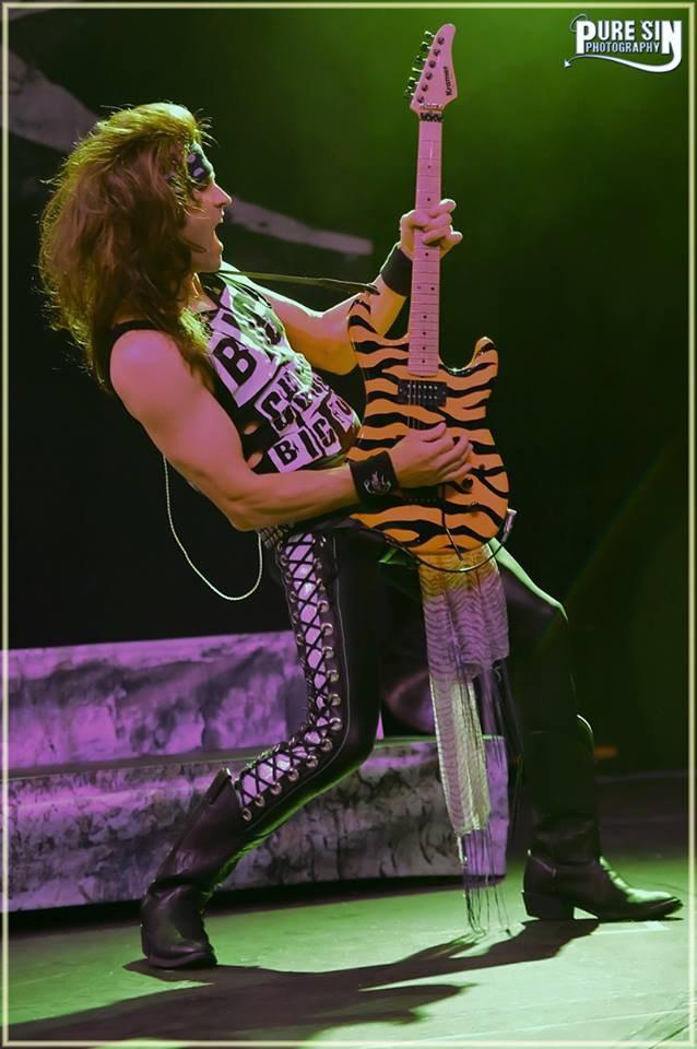 hanging off his belt, and some serious kick ass black cowboy boots. His guitar covered his shirt so I was unable to read the entire quote I could only get “Big Guns Big” but we can all assume the rest. He played a blue panther printed Kramer guitar. They only played 9 songs but they filled up the rest of the time with some crazy antics. The first song of the set was „Pussywhipped‟ oddly enough many of the women in the audience even knew the lyrics to this obviously classic hit. In between each song a lot of joking teasing and audience participation occurred. The drummer Zadinia would occasionally place the drumsticks in his mouth as if he was a walrus. They continued with „Party Like Tomorrow is the End of the World‟, and brought out Marty Friedman for „Asian Hooker‟. About this time they brought up some lady that was a little lit, stumbling around on stage taking off her shirt. She sat up there while they played „Just like Tiger Woods‟. The hit of the night was „I Love it Loud‟ with Tommy Thayer, he continued to play with them to „Gang Bang at the Old Folks Home‟. They kept up with