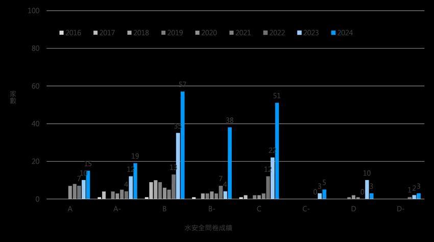 獲得C等級的家數為58家,占所有企業的 21%,比2023年成長190%;而D的家數為33家, 占所有企業的12%,比2023年成長267%。至於 B-、C-與D-,歷年的家數或成長率變化,相對其 他等級都較低。