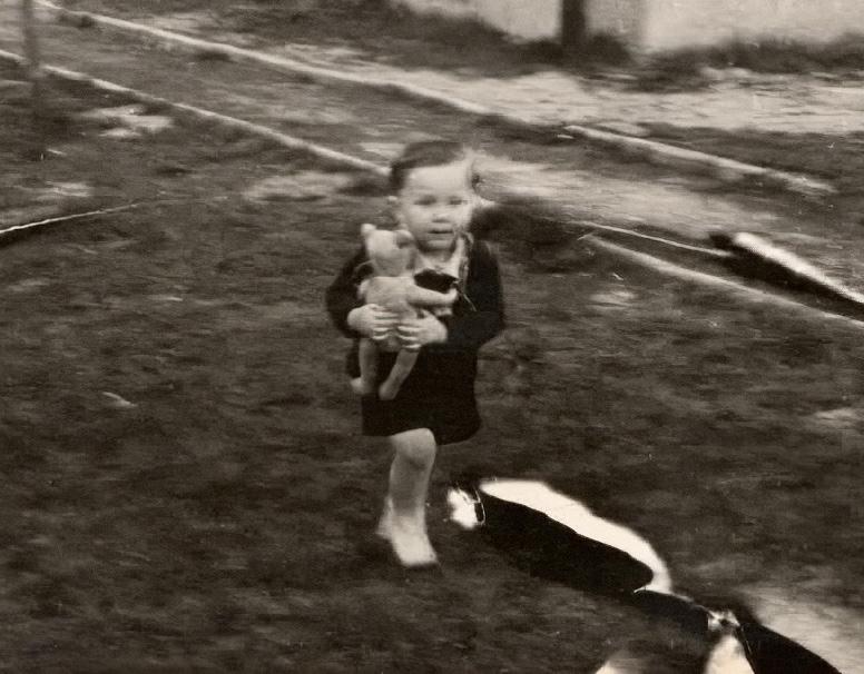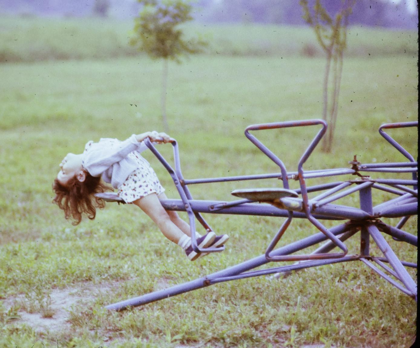 I was captivated by a photo of my dad as a young child in a refugee camp, holding a teddy bear. I compared it to one I found of myself at a similar age, stretching to look at the sky as I spun on playground equipment. I remember leaning all the way back on merry-go-rounds and swings, looking up at the clouds and feeling like I was flying amongst them. I considered my father’s traumatic early years, and I compared it to my own relative freedom.