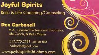 diamondworkmichigan.org Intuitive Coaching Ruth Wilson Intuitive Coach Personal Training to Develop Your Inner Magic 248-990-1902 www.ruth-wilson.com Book a Consult: https://go.oncehub.com/Ruth-Wilson Life Coaching Grief Resources for Conscious Living ADS are a super affordable way to advertise in print and online! Contact Tana at tana@crazywisdom.net for more information. Dance Dance • Healing • Illumination • Unity • Love Nia • Gentle Nia • Dance for PD Assisted Living Classes • Wild Woman Work meagaindance.com • megansims600@gmail.com RAVENSONG COUNSELING Individual & Small Group Sessions for Ages 10+ www.ravensongcounseling.com (734) 604-7074 Equine Therapy at Hidden Creek Healing Farm Believe in your journey Kate Roos, MAAT, ATR, TCTSY-F Movement & Art Therapy www.kate-roos.com734-221-0202 A Trauma Informed Practice For Teens and Adults Catalyzing revolutionary healing through Trauma-Informed Homeopathy Intrinsic Coaching Holistic Health Education Kellie Mox, MPH, DCHM, CCH Kelliemox.com heal@kelliemox.com | 734 - 476 - 0349 Free,20-minuteexploratorysessionfornewclients