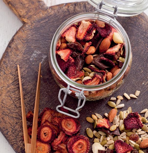 Handful each of dried Queensland strawberries, almonds, pepitas, dark chocolate, granola into a clean jar, shake to mix.