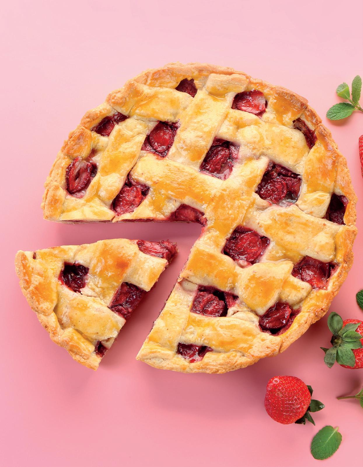 6. Pile the Victorian strawberry filling into the pie shell. Slice the remaining pastry sheet into 1.5cm strips. Brush the outside rim of the pie shell with egg wash and create the lattice top by weaving the strips of pastry and pressing the ends into the pie edge. Brush the pastry with the remaining egg wash and bake for 15-20 minutes until the lattice top is cooked through.