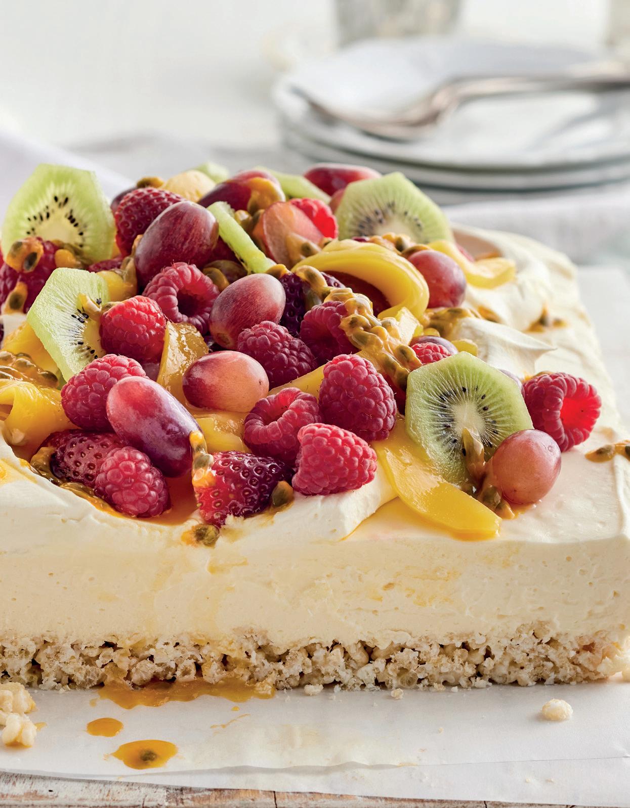 2. To serve, dollop remaining whipped cream over the top of the cheesecake mixture. Arrange fruit over the top. Cut into slices and serve immediately.