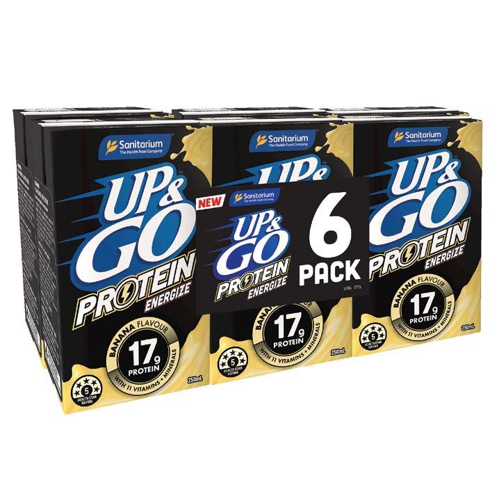 UP&GO Protein Energize Banana Flavour contains 11 essential vitamins & minerals, 17g of protein, fibre, high in calcium and Low GI.