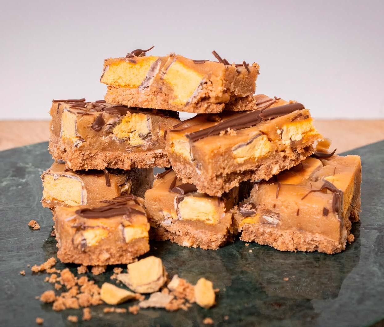 4. Pour into the prepared slice tin and firmly press down using a spatula or flat-bottomed glass. Refrigerate until set.
