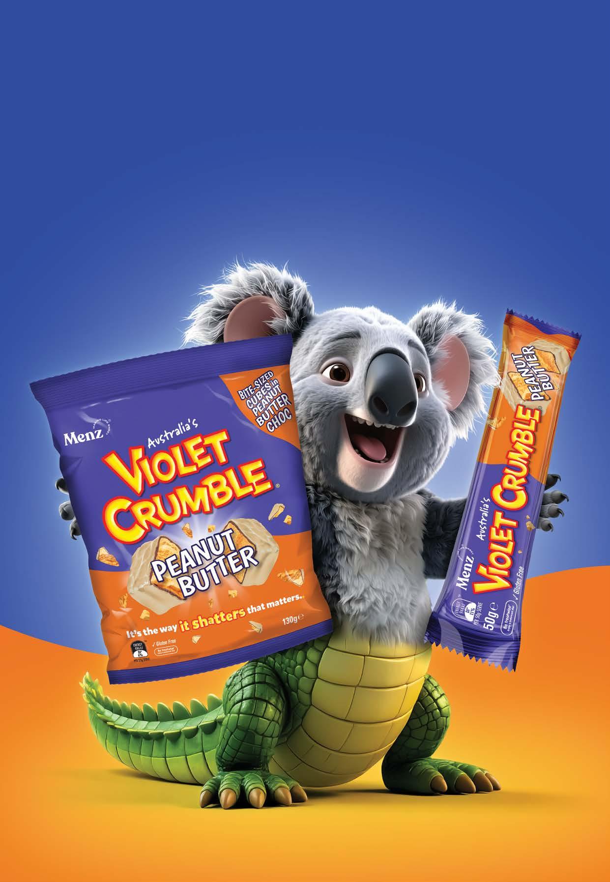 3. Violet Crumble Peanut Butter Layer: Mix peanut butter, condensed milk and vanilla. Fold in crushed Violet Crumble. Spread evenly over the base.