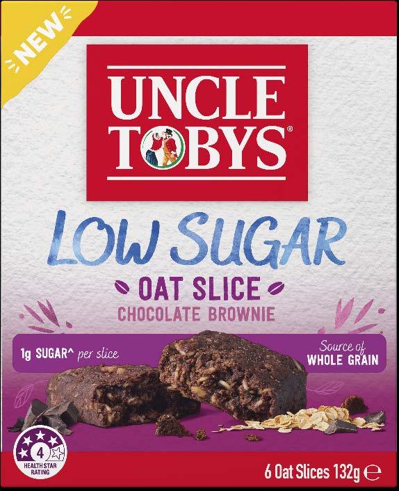 NEW UNCLE TOBYS Low Sugar Oat Slice is the perfect afternoon treat! Crumbly, moist, and big in taste, with an average 1g sugar per slice. Available in Choc Brownie and Honey Macadamia.
