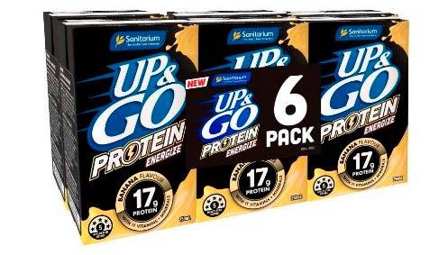 UP&GO Protein Energize Banana Flavour contains 11 essential vitamins & minerals, 17g of protein, fibre, high in calcium and Low GI.
