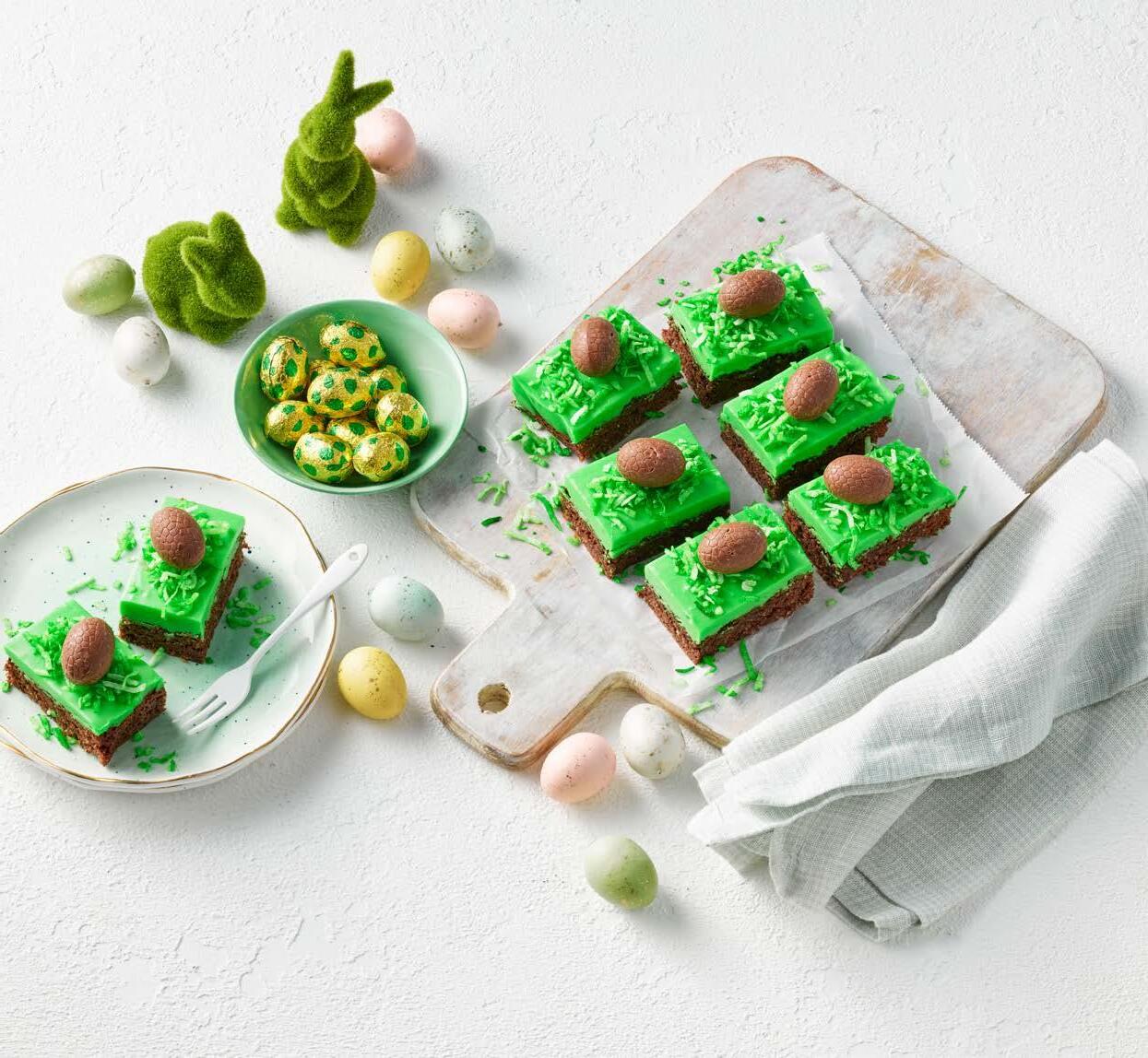 6. Refrigerate to set. Place extra shredded coconut in a small ziplock bag with a few drops of green food colouring. Shake until the coconut is green, then scatter over the slice.