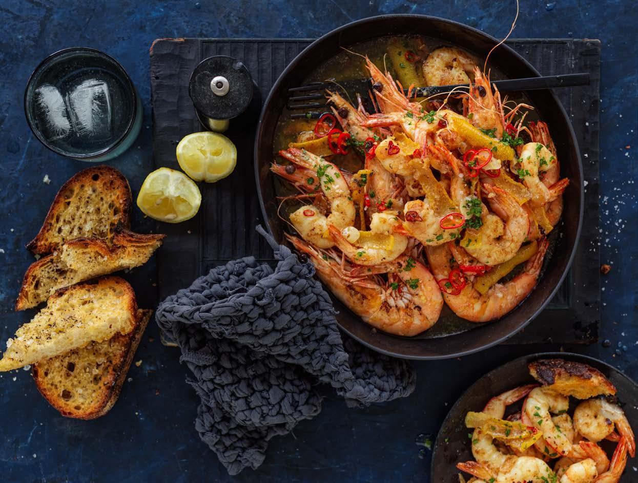 3. Add remaining butter, oil, garlic, peeled prawns, zest and chilli. Cook turning prawns and basting occasionally for 1-2 minutes or until prawns are cooked through.