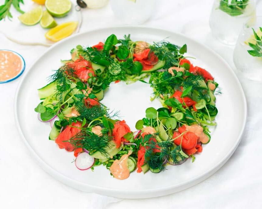 4. Roll up the slices of Barossa Fine Foods Wild Smoked Salmon and place around the wreath, then scatter over the dill fronds, parsley leaves and watercress.