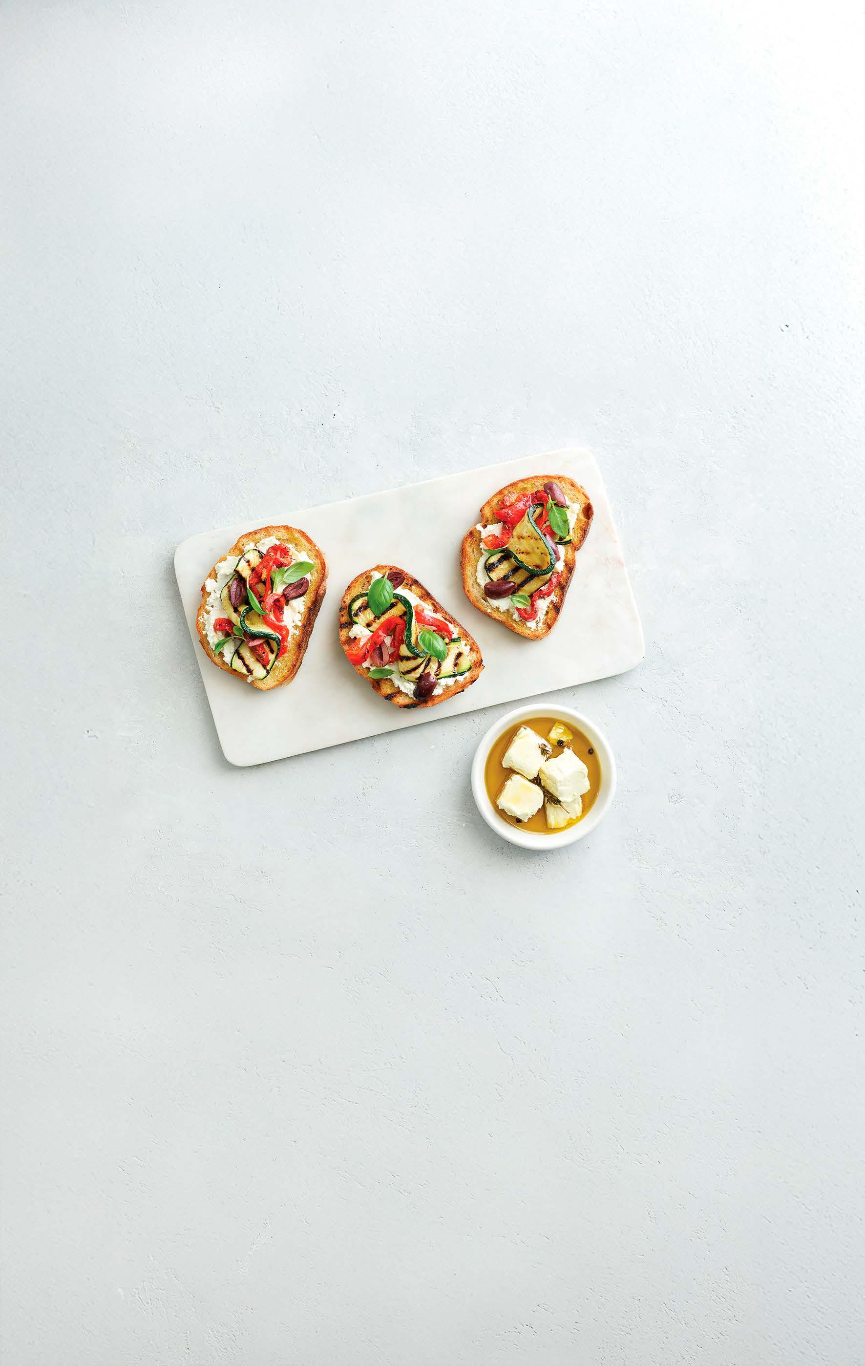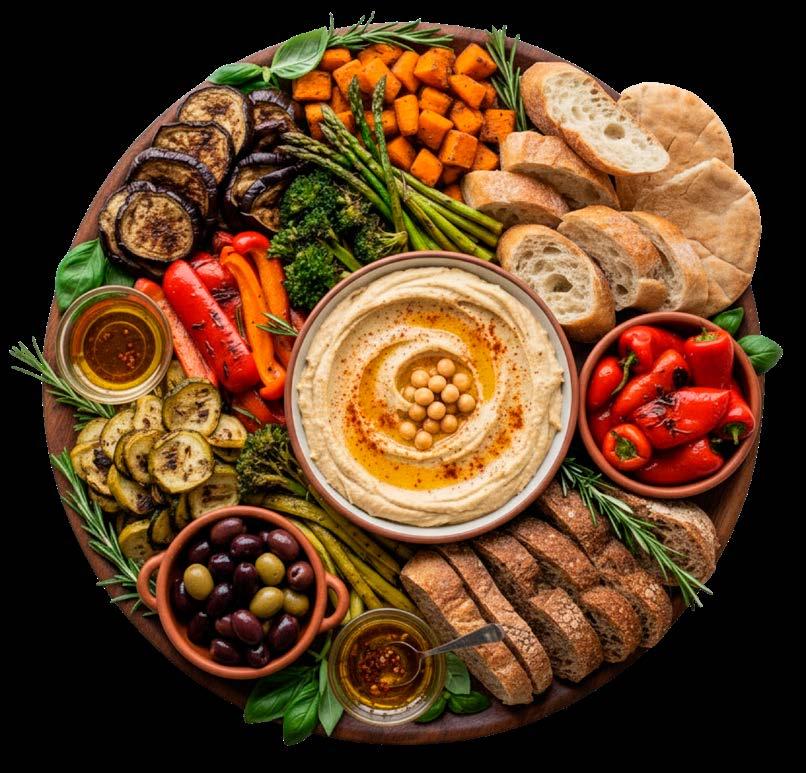 fill a platter with roasted vegetables, hummus, olives, stuffed peppers, and artisan breads with dipping oils.