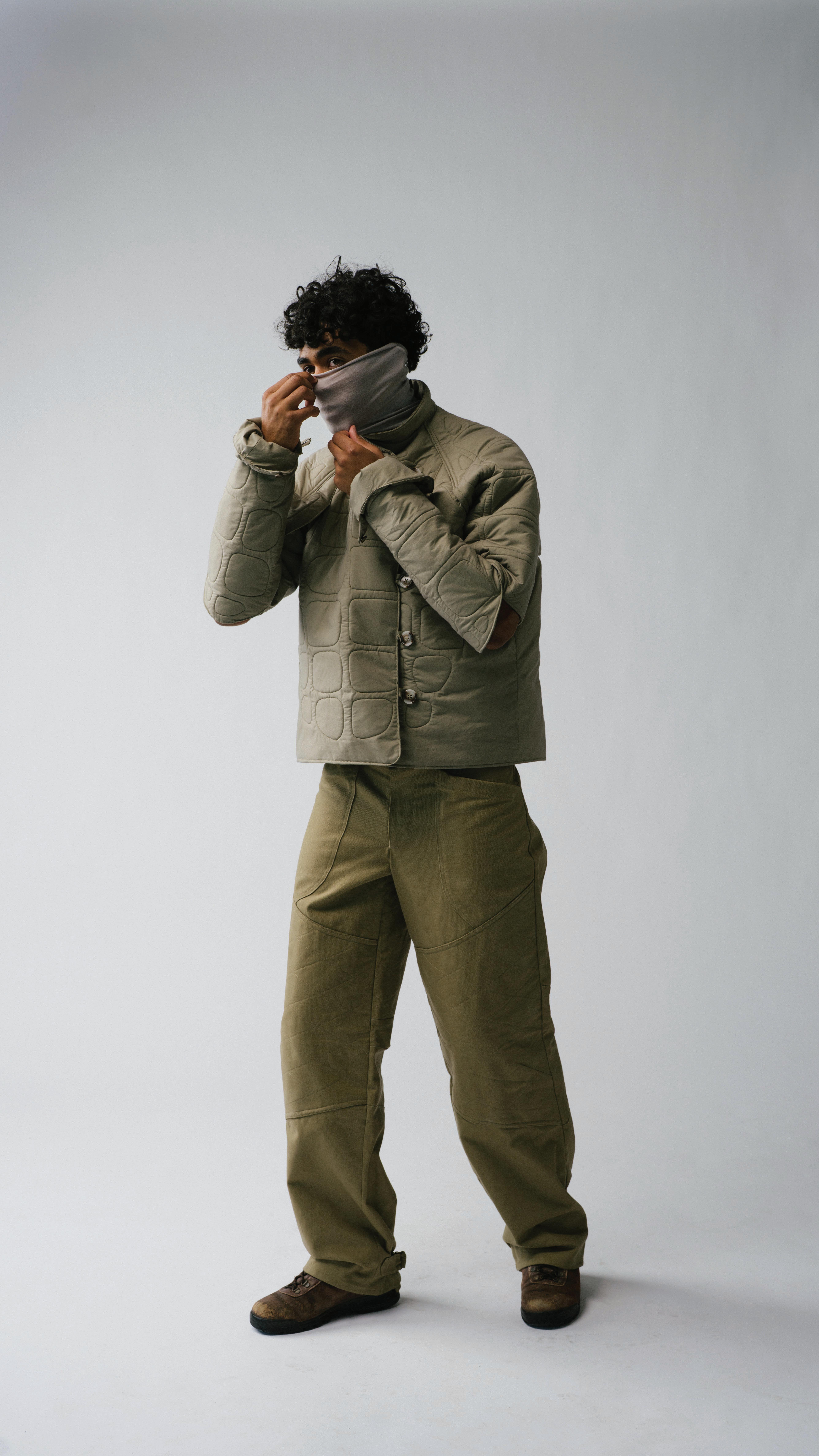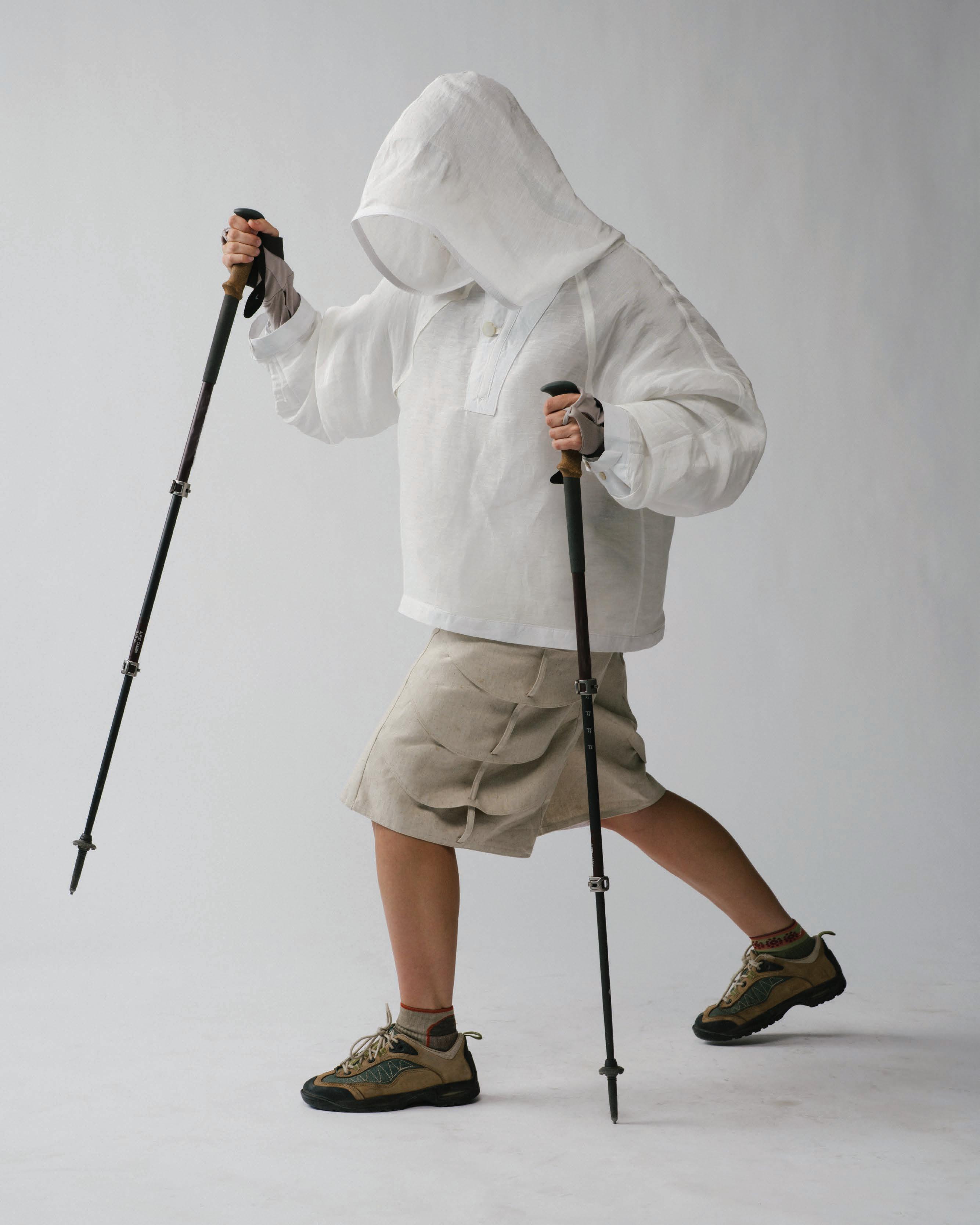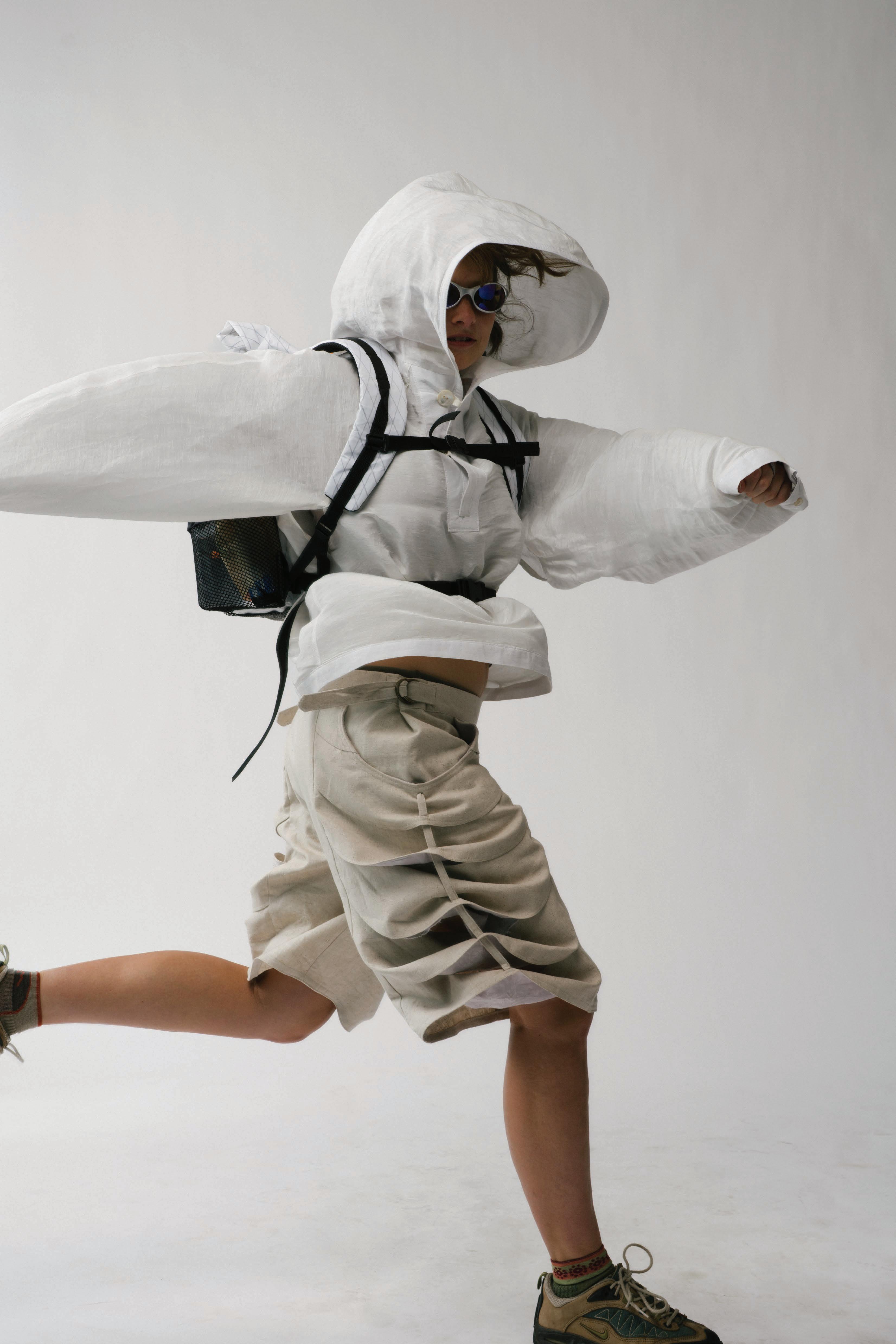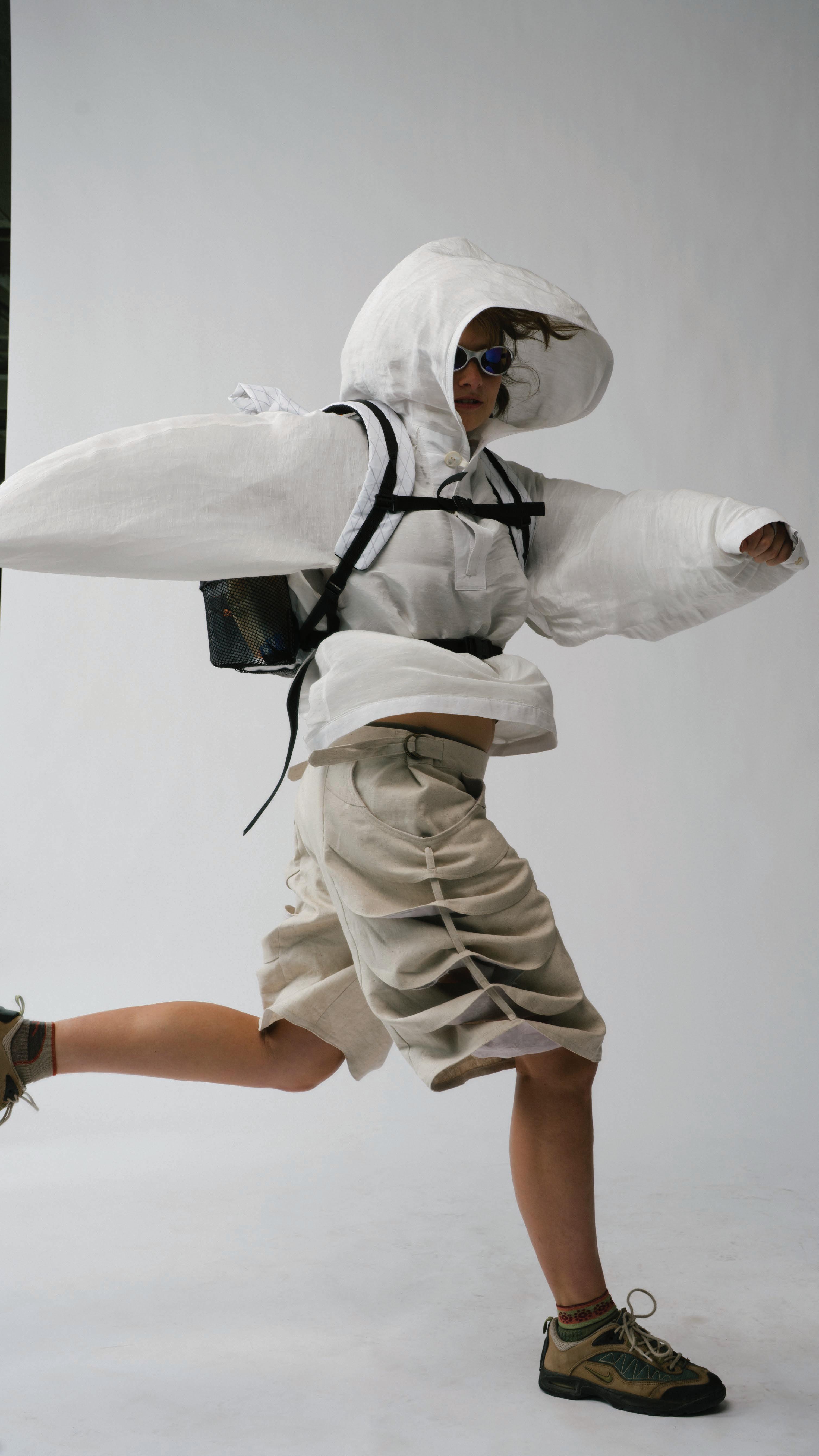 In studying how fear has pushed life to evolve, each garment is engineered to mimic a di erent organism’s survival strategy. Drawing from military and extreme weather gear, these elements form three layering systems that move, breathe, and shelter the wearer across uncertain environments.
