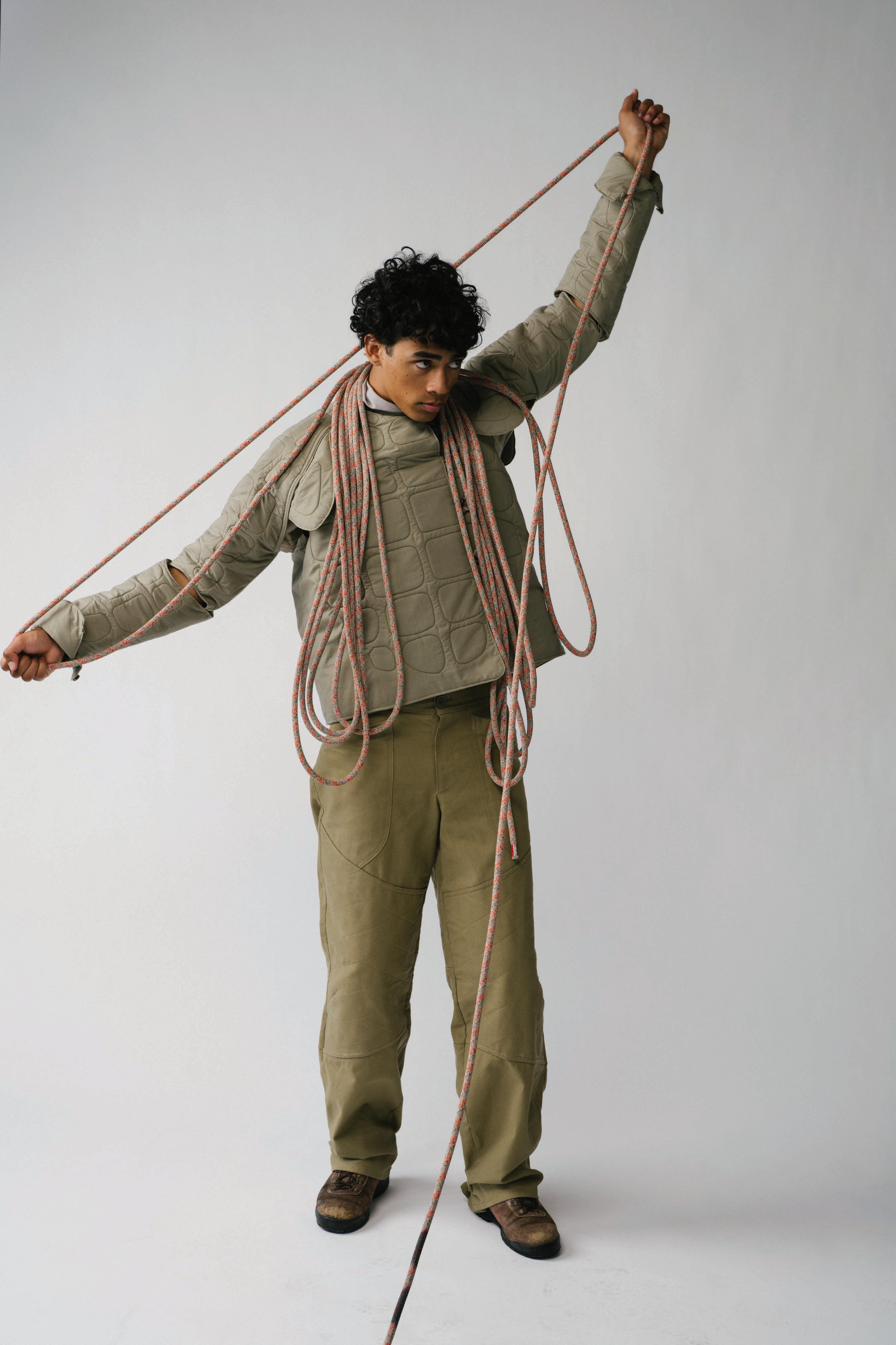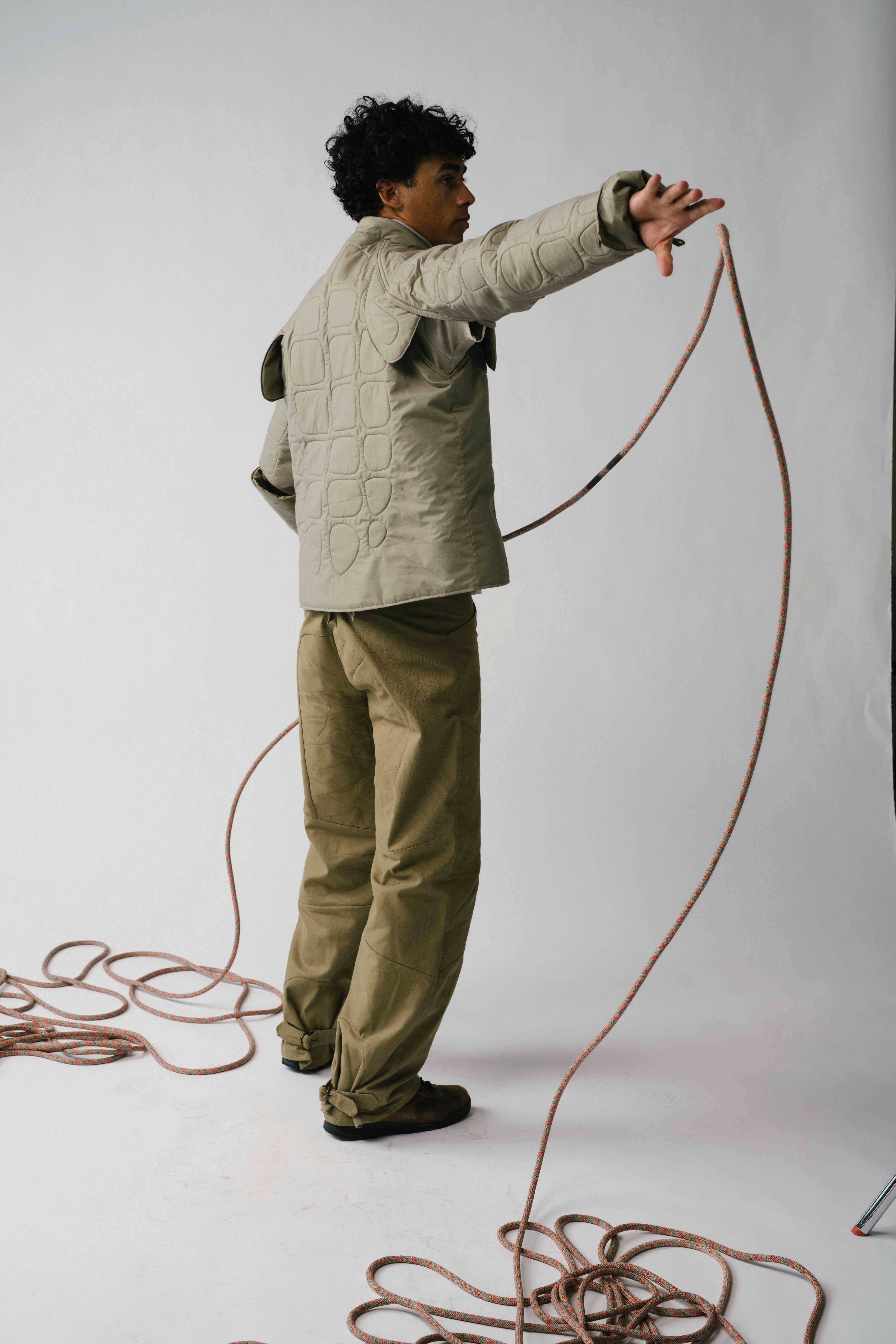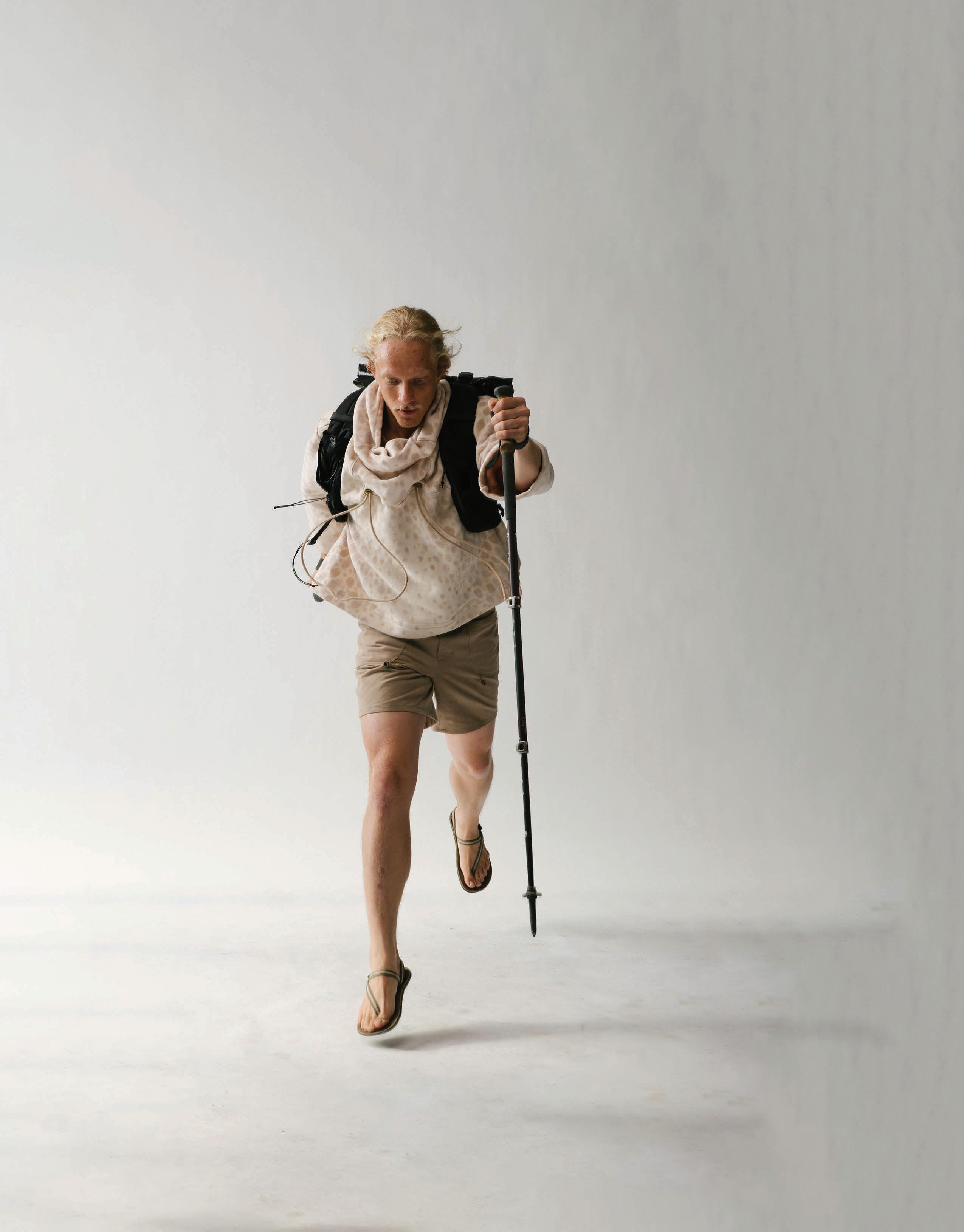 In studying how fear has pushed life to evolve, each garment is engineered to mimic a di erent organism’s survival strategy. Drawing from military and extreme weather gear, these elements form three layering systems that move, breathe, and shelter the wearer across uncertain environments.
