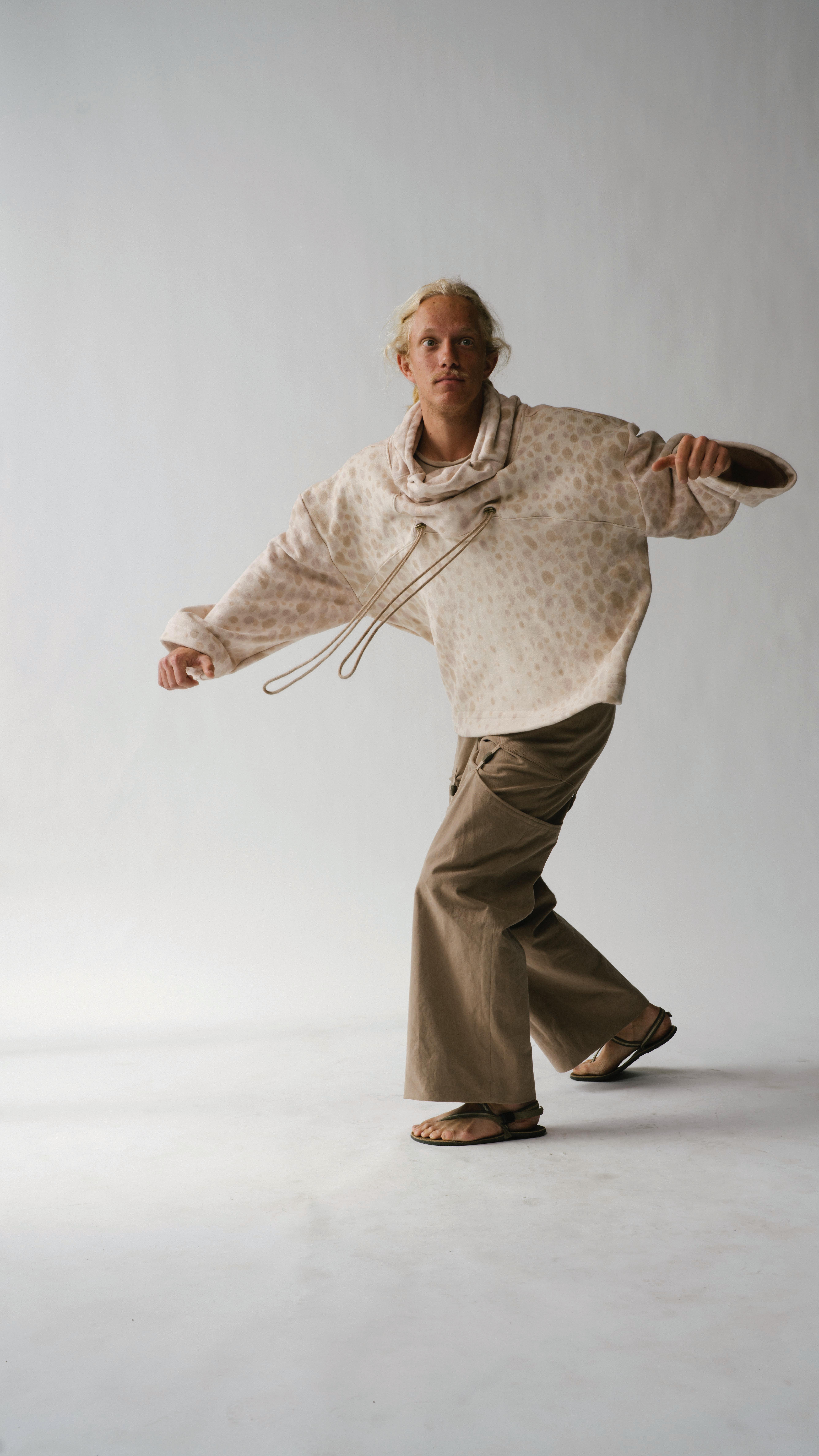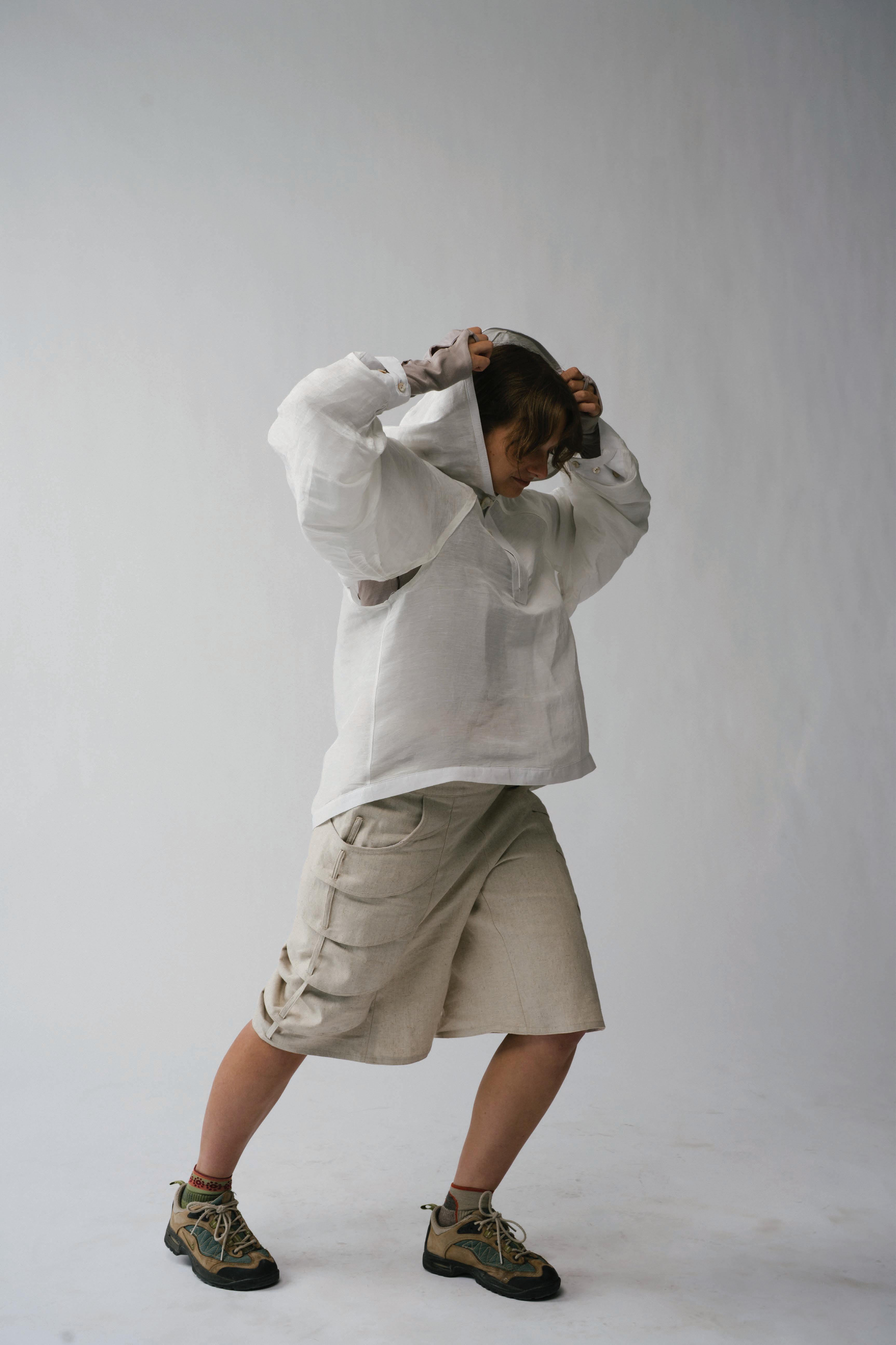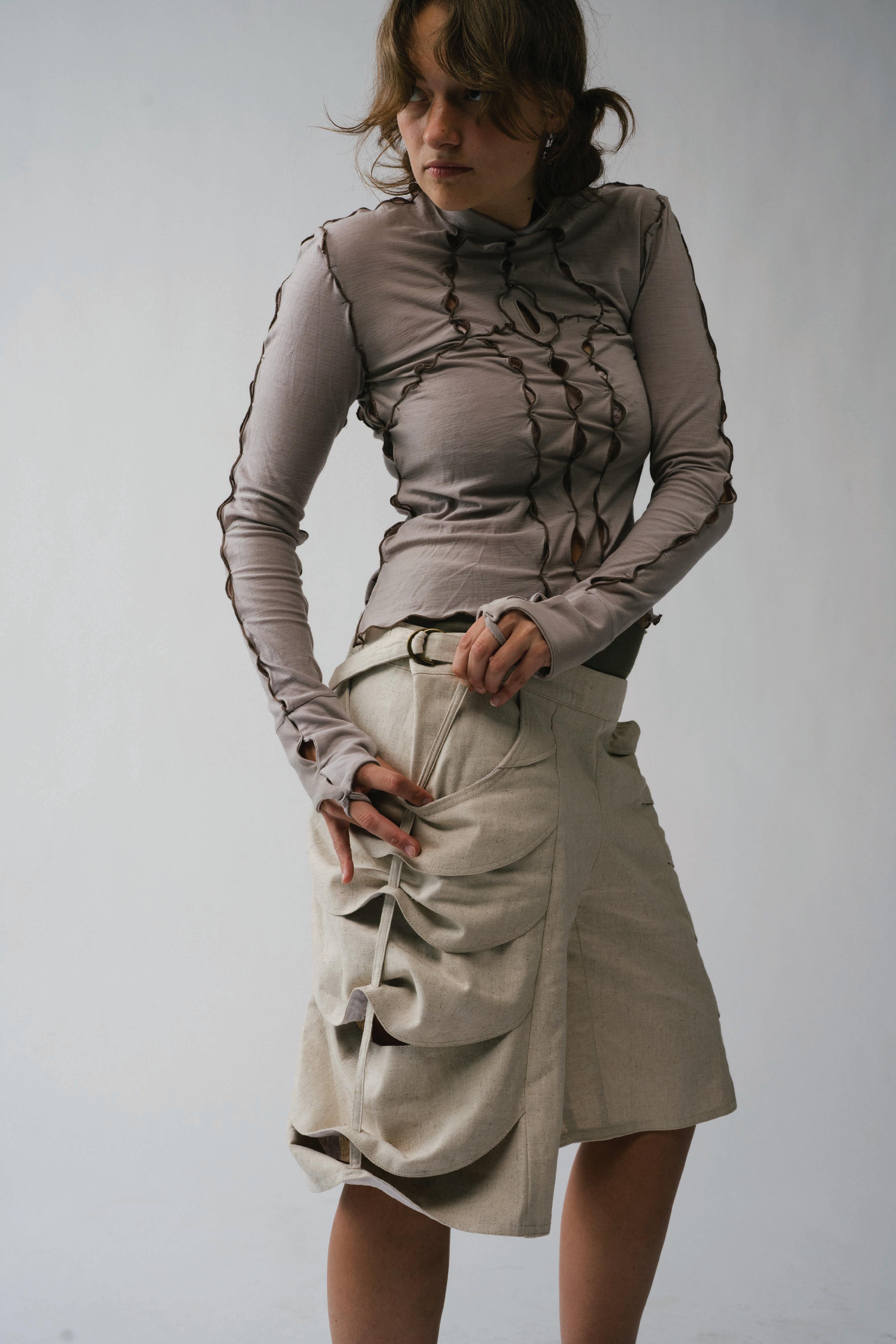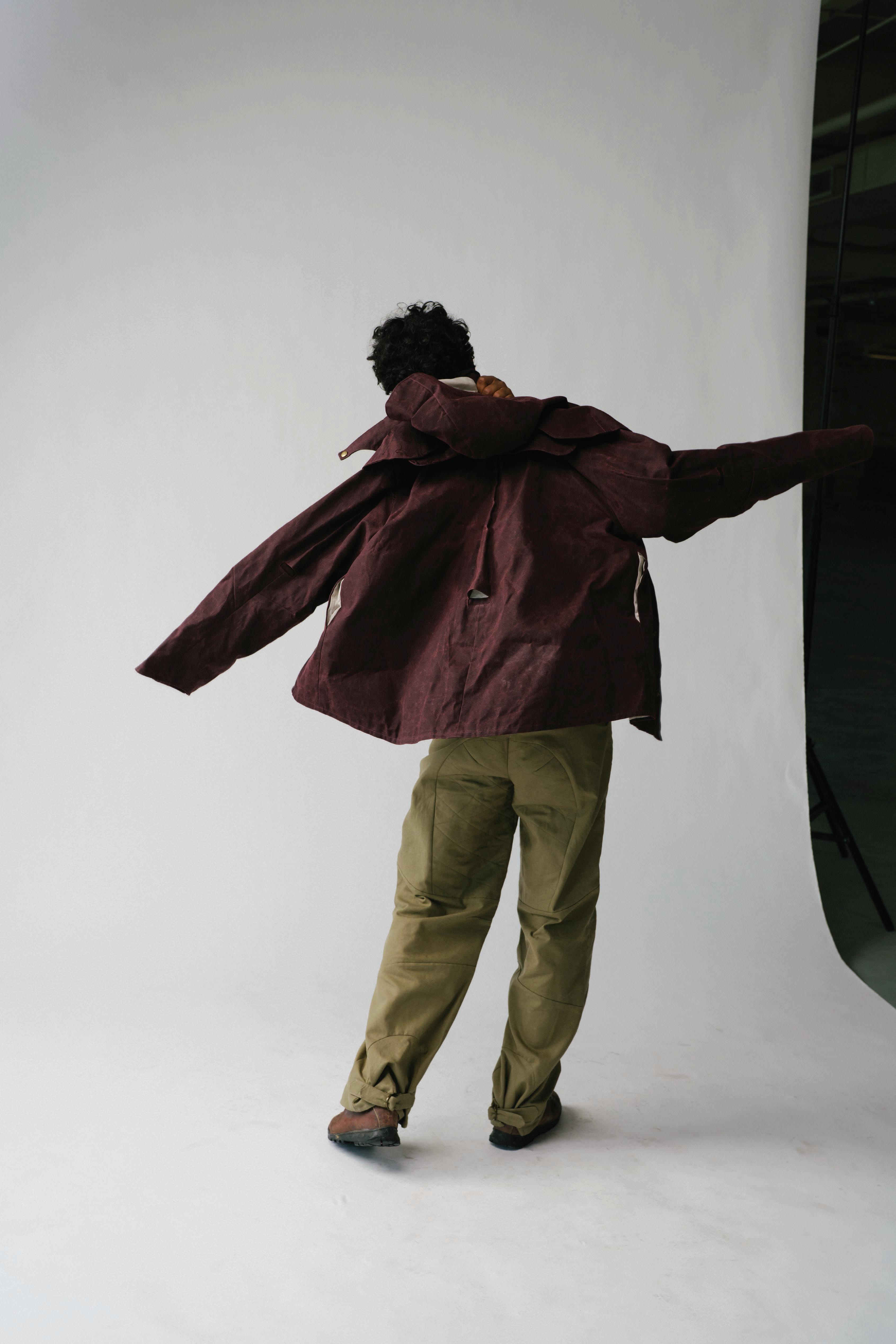 In studying how fear has pushed life to evolve, each garment is engineered to mimic a di erent organism’s survival strategy. Drawing from military and extreme weather gear, these elements form three layering systems that move, breathe, and shelter the wearer across uncertain environments.