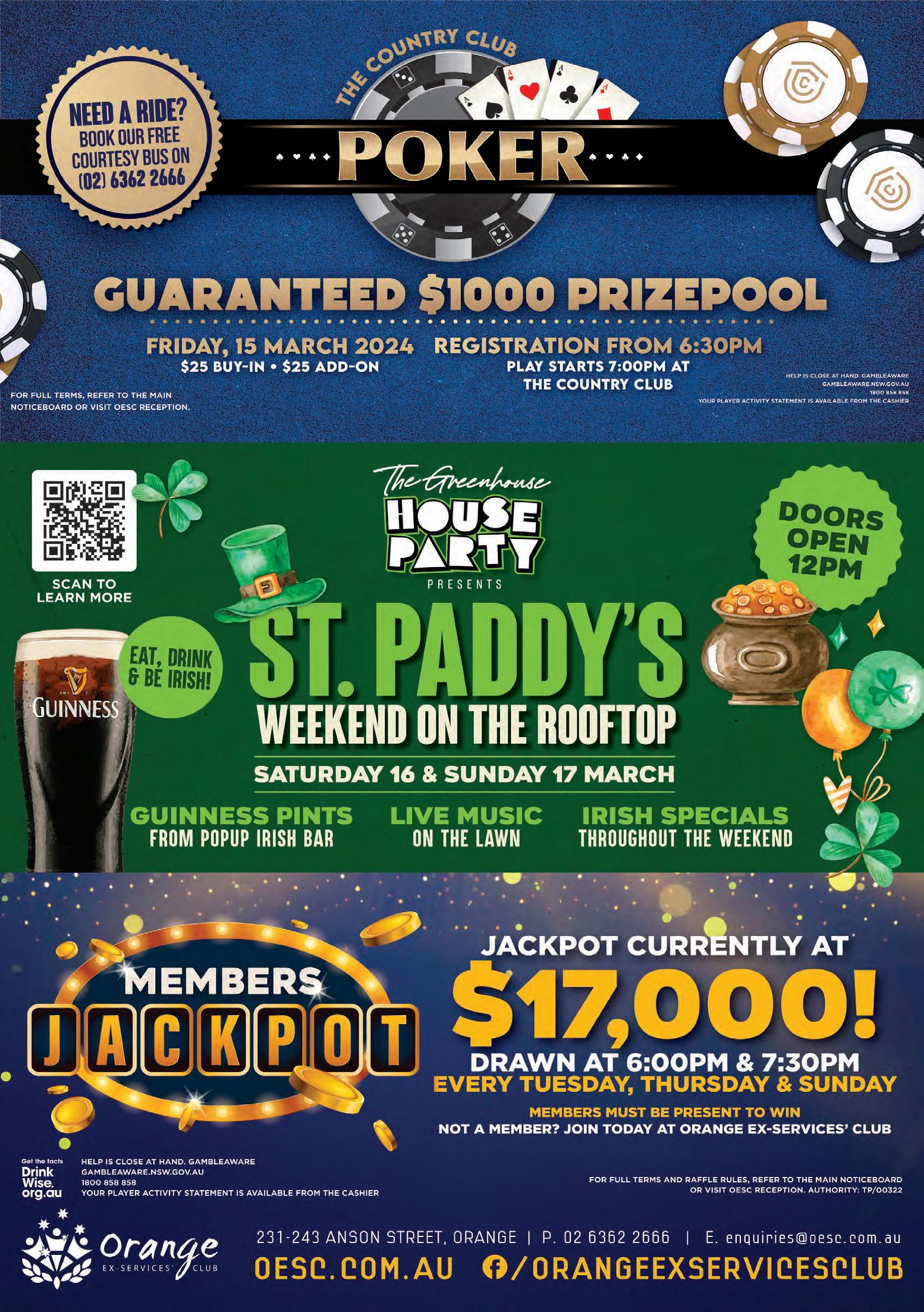 ORANGE CITY LIFE | MARCH 7 — 13, 2024 5 Community LiFE The VicToria hoTel 336 Summer St, Orange | Tel 6362 6386 WHAT’S ON AT THE VIC... POKER TUESDAY from 7pm SATURDAY from 3.30pm Registration on arrival Registration on arrival 8PM - LATE FREE ENTRY SUNDAY 9TH MARCH 2PM - 5PM FREE ENTRY Paul Albert J&M BISTRO Come celebrate St Patrick’s day Lunch 12-2.30pm Guinness Pie Lamb Shank Roast Beef Bookings essential Enjoy a Cold Guinness Q: What is full of inequity but doesn’t discriminate? A: Playing Rugby with Orange City Lions CONTACT DARREN ON 0428 421 928 OR SENIORS@ORANGECITYRUGBY.COM.AU TO FIND OUT MORE Orange City Rugby Club is arguably, one of Australia’s most inclusive rugby union clubs. At our Club, we don’t discriminate - there is a place for everyone! Whether you are male, female, tall, stocky, petite, competitive, social, or somewhere in between, there is a position for you at our Club. If you’re looking for a new challenge or a fresh change, there is no better time than the present! WE HAVE 3 MEN’S TEAMS, AN U19 COLTS TEAM (AGE 16-19), AN OPEN AGE WOMEN’S TEAM, AS WELL AS JUNIOR TEAMS RANGING FROM U6 TO U16S Come and experience the difference, we know you’ll love it!