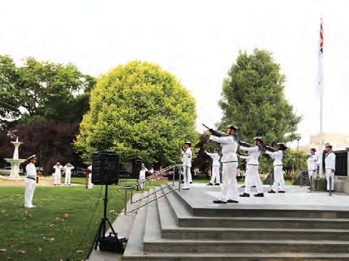 Sailors from HMAS Harmon fire a volley at the Cenotaph in Robertson Park as part of naval tradition that dates back to the age of sail.