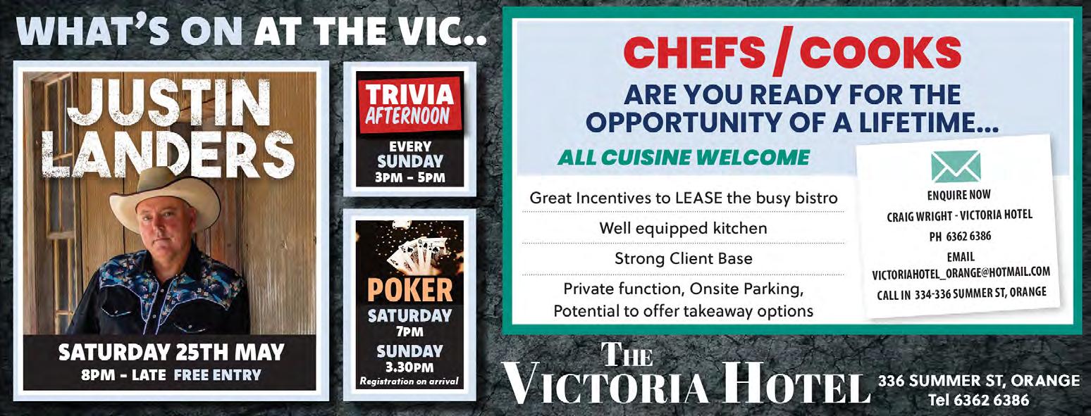 Bookings: 02 6393 8111 www.orange.nsw.gov.au/theatre Orange Civic Theatre Details correct as of 21.05.2024 - for all shows and updates please visit our webpage www.orange.nsw.gov.au/theatre • 2024 season brochure and membership is open for purchase. Please contact the box office for more information. Premier Entertainment presents ELECTRIC LIGHT ORCHESTRA TRIBUTE SHOW Friday 24 May at 8pm Bell Shakespeare presents A MIDSUMME R NIGHT’S DREAM Thursday 30 May at 7.30pm The Robertson Brothers present 60’S VARIETY TV SHOW Saturday 1 June at 2pm Run Like Hell presents DARK SIDE OF THE MOON A TRIBUTE TO PINK FLOYD Friday 14 June at 8pm MICF presents MELBOUR NE INTERNATIONAL COMEDY FESTIVAL Saturday 15 June at 8.00pm MAY 23 — 29, 2024 ORANGE PROPERTY MARKET — STARTS ON PAGE 31 Ahoy, mateys! Students at Spring Hill Public Hill set sail for a day of swashbuckling adventure on Friday, May 17, and all for a good cause! Dressing up in their best pirate fashion the students eagerly took part in the annual Pirate Day ndraiser, raising money to help ght kid’s brain cancer. It looks like they had a lot of n while doing so! FREE EVERY THURSDAY