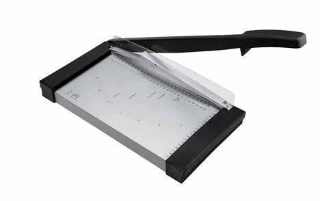 Taglierina a leva con struttura e piano in metallo prestampato con formati DIN. Sistema di bloccaggio fogli per evitare che la carta si muova durante il taglio. Comoda impugnatura a leva.