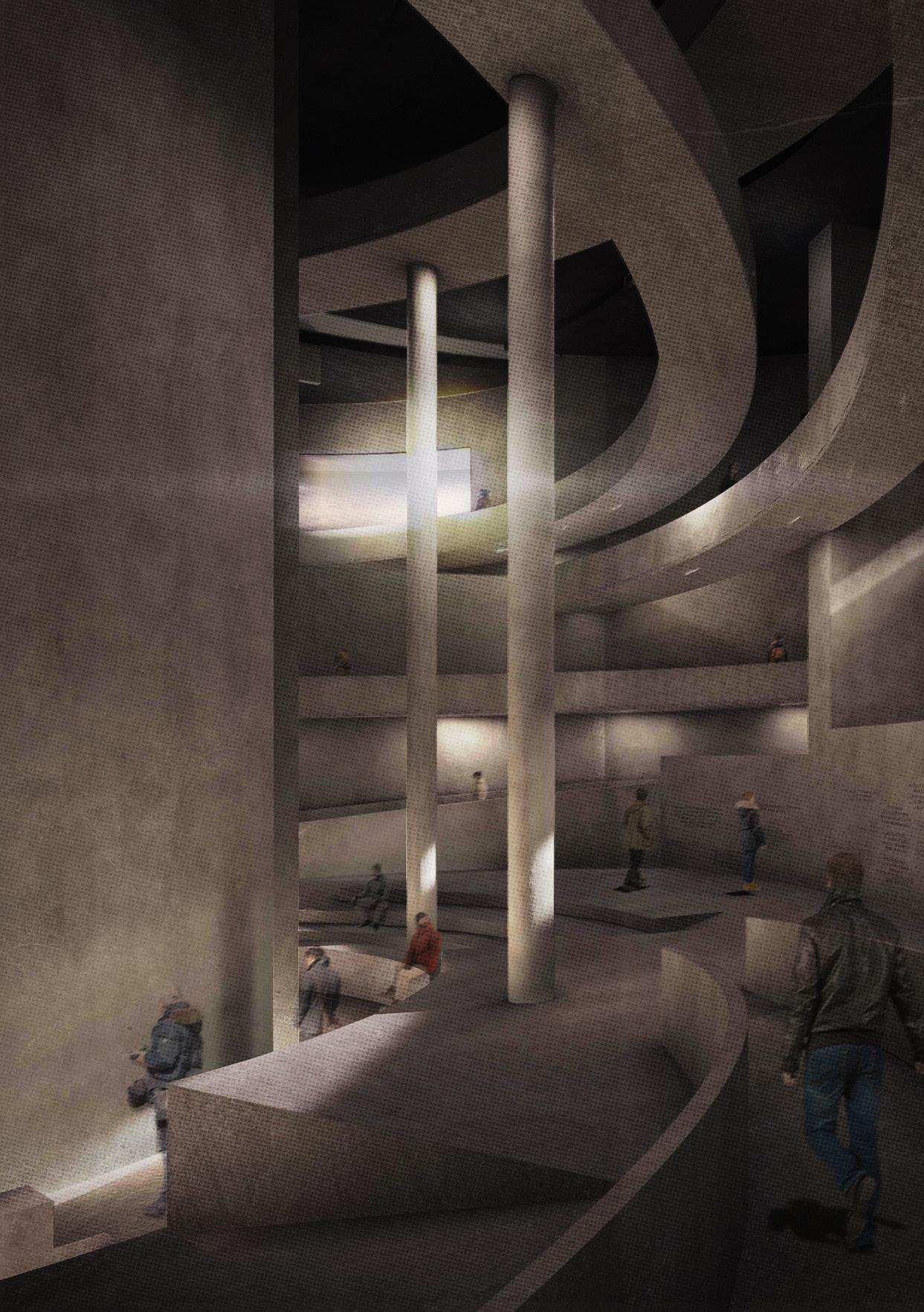 The lower level establishes a continuous winding pathway that descends and acts as a subjective and singular experience.