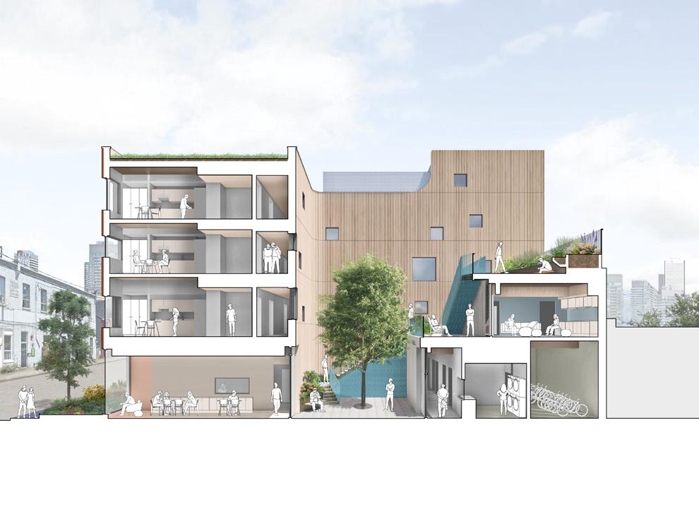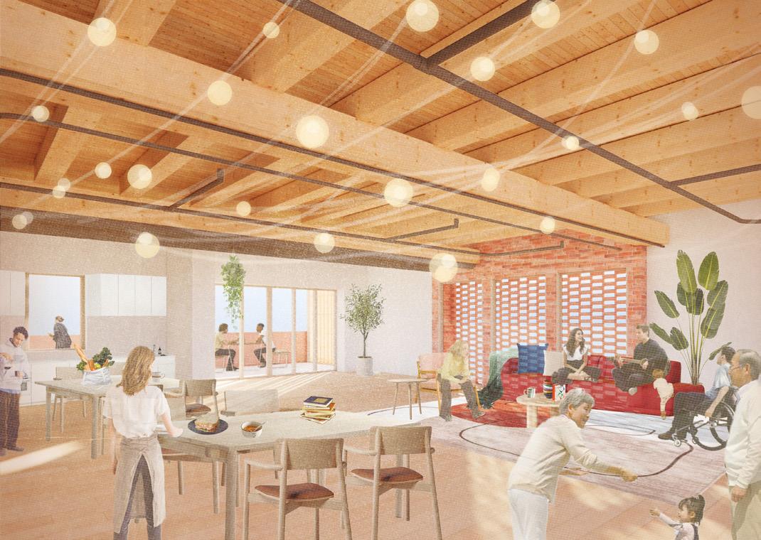 A transitional shared space between the two encourages interaction, while shared indoor amenities on each floor support communal dining and living. A rooftop terrace offers outdoor gathering space, reinforcing a sense of community, while each unit has a private balcony for retreat.