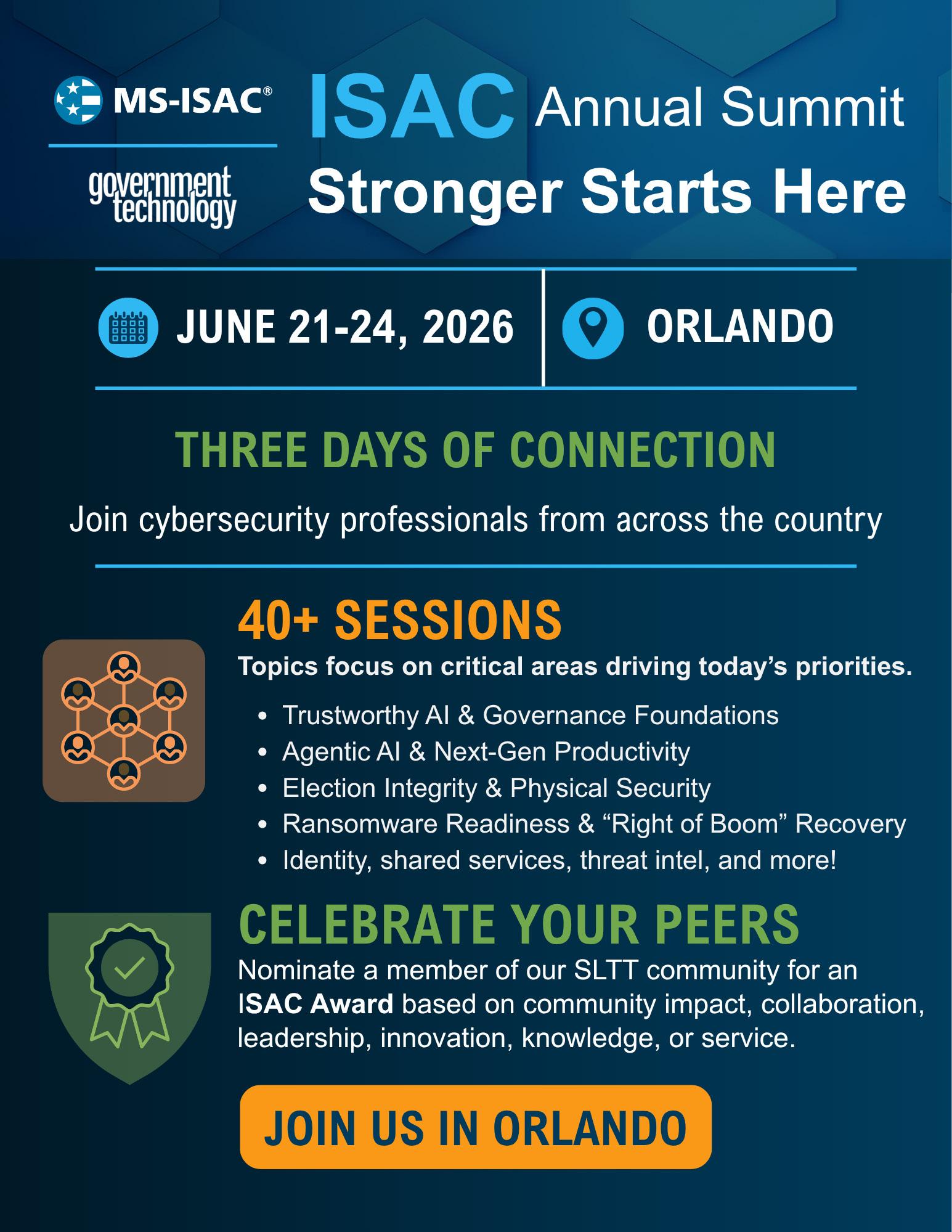 The ISAC Annual Summit will take place at the Caribe Royale in Orlando, FL. This gathering marks the 19th ISAC Annual Meeting — celebrating nearly two decades of U.S. SLTT collaboration and community defense. Attendees will engage with peers, gain insights from shared U.S. SLTT best practices, and enhance their security, resilience, and continuity strategies to better protect U.S. government networks and systems. Over three days of immersive learning, attendees will gain actionable security, resilience, and continuity strategies from subject-matter experts from the Center for Internet Security (CIS), the MultiState Information Sharing and Analysis Center (MS-ISAC), U.S. SLTT peers, and industry partners in over 40 sessions. Learn more and register at https://www. cisecurity.org/event-calendar/annualisac-meeting.