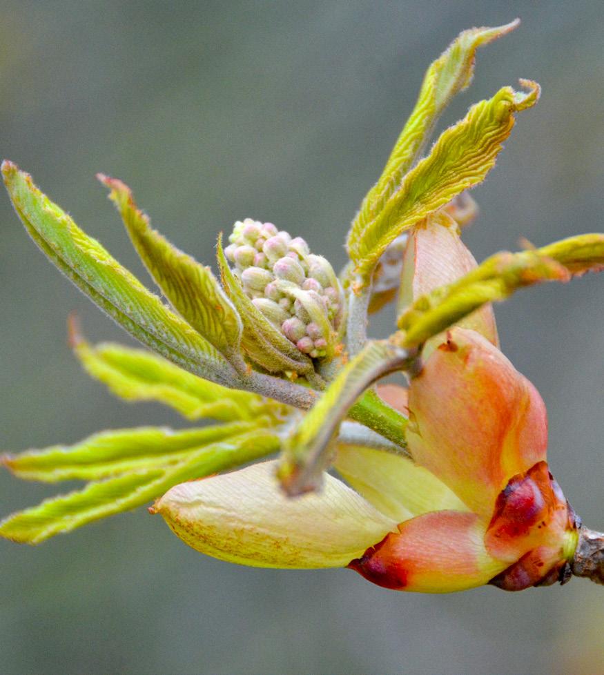 The buckeye tree (Aesculus) is one of the first trees to leaf out in spring and is also an early bloomer. This image shows a bud just beginning to burst open, emerging from the protective scales that kept it safe through the winter.