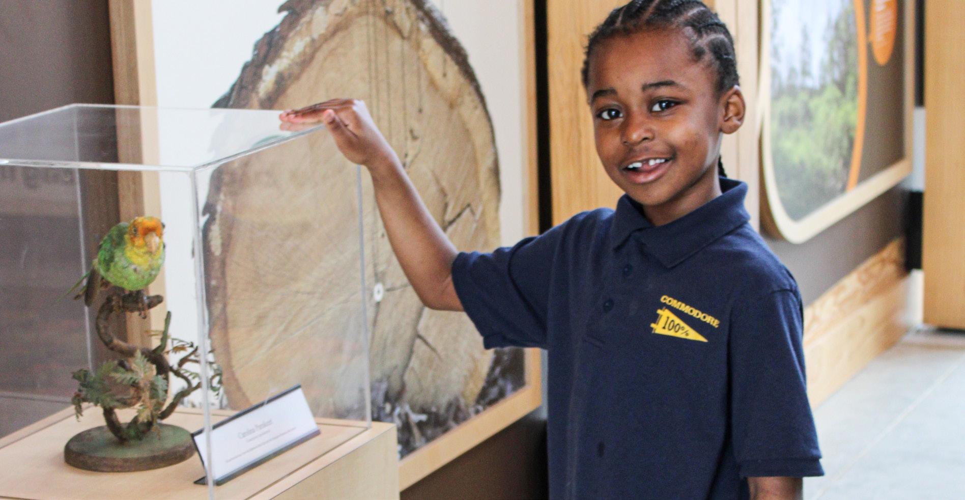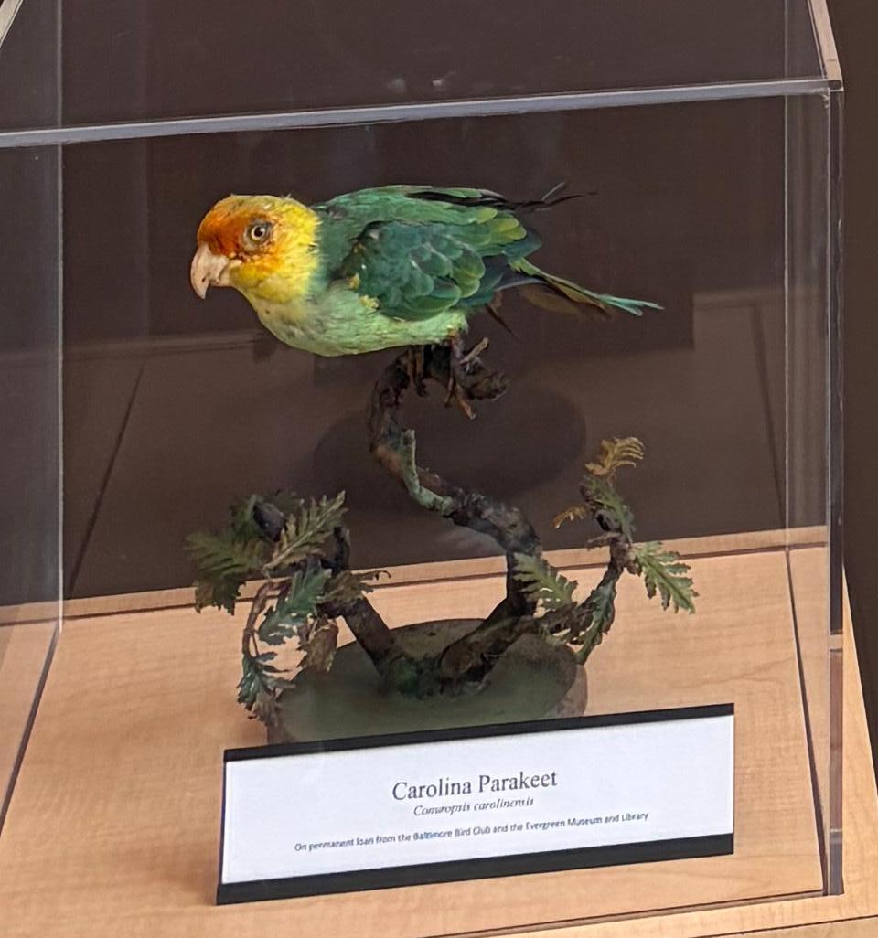 at Cylburn Arboretum in the Nature Museum inside the Cylburn Mansion before moving to the Carriage House and now the Nature Education Center. One of the most significant specimens is a mounted Carolina Parakeet, on permanent loan as part of the Garrett Collection of the Evergreen Museum & Library.