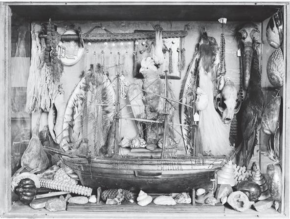A typical display of curios from the nineteenth centure included shells, bird's feathers, and mounted birds.