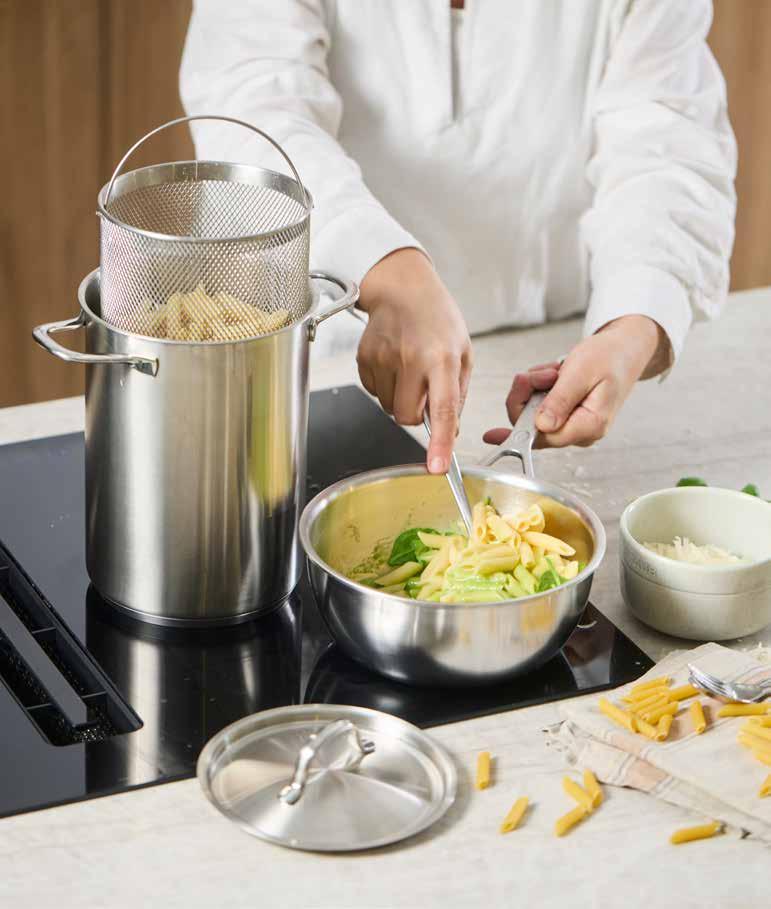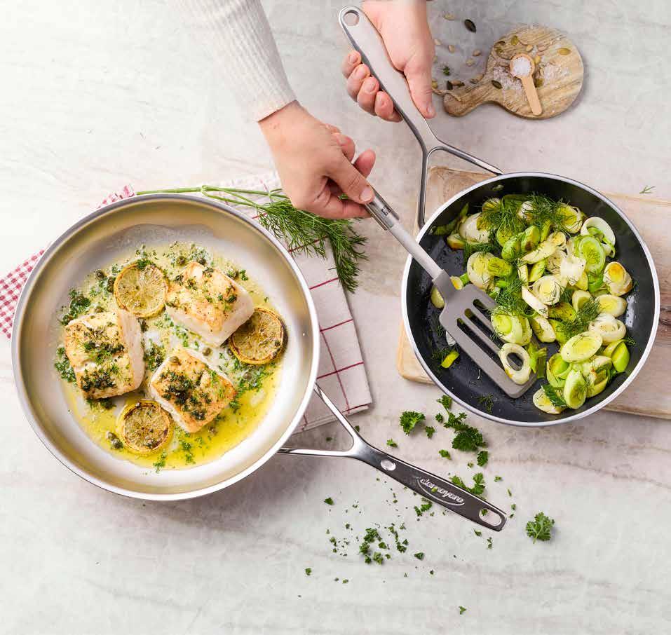 BEVAT: kookpot 18 cm - 2,2 l, kookpot 20 cm - 3 l, conische sauteuse 20 cm - 2 l