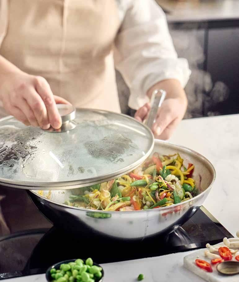 Heet in het midden, koeler naar de rand. Ideaal om te roerbakken en vervolgens warm te houden onder een glasdeksel.
