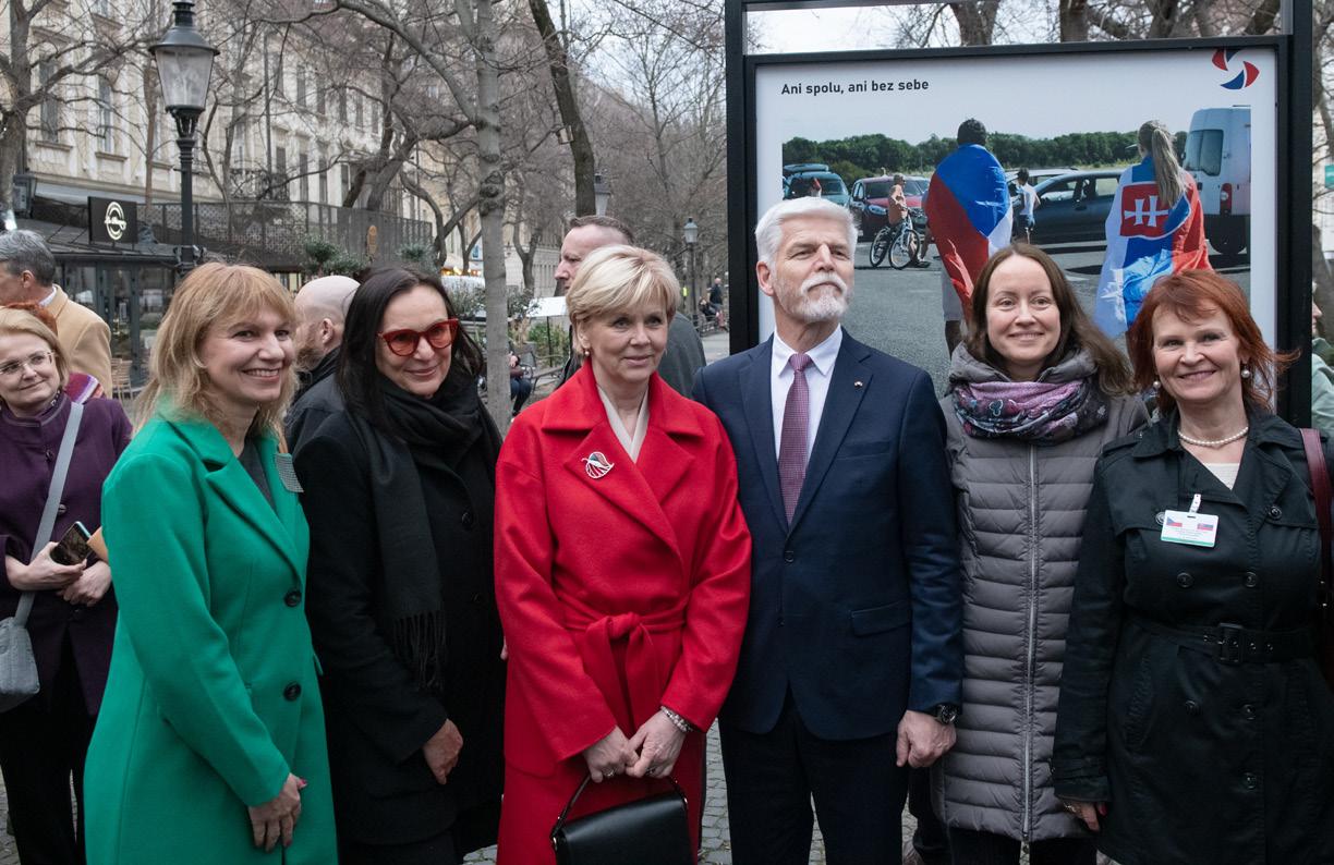 Prezident Petr Pavel s první dámou Evou Pavlovou, s ředitelkou Českého centra Bratislava Monikou Koblerovou a zaměstnankyněmi českého velvyslanectví při prohlídce výstavy Česko/slovenské okamžiky © Peter Korček